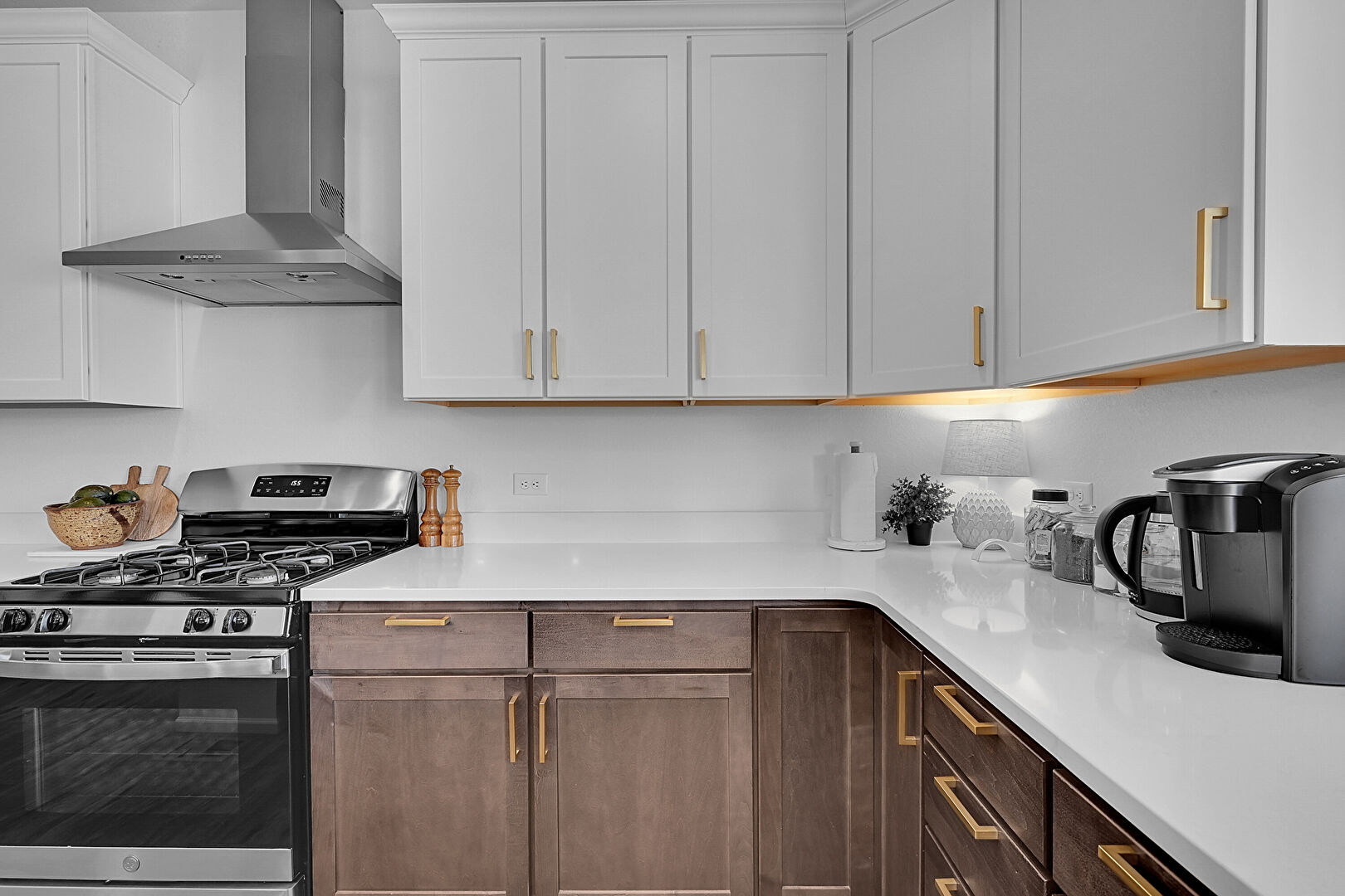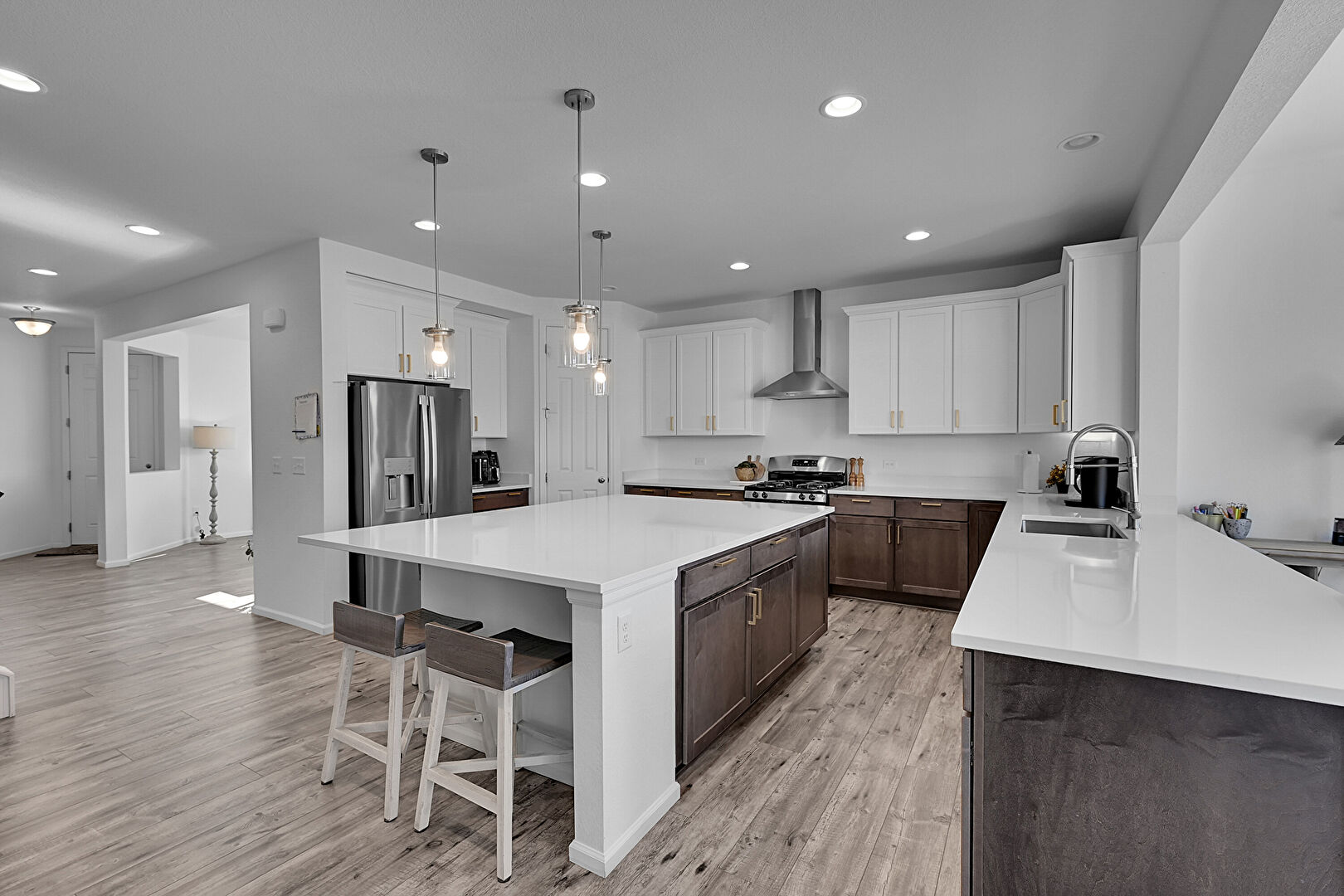 Crown Molding Cabinets, Dark Brown Cabinets, Drywall, Kitchen Bar, Kitchen Island, Pendant Lighting, Recessed Lighting, Shaker Cabinets, Stone Countertops, U Shaped Kitchen, Wood Finish Floor, Baseboards Wall, Shaker Cabinets