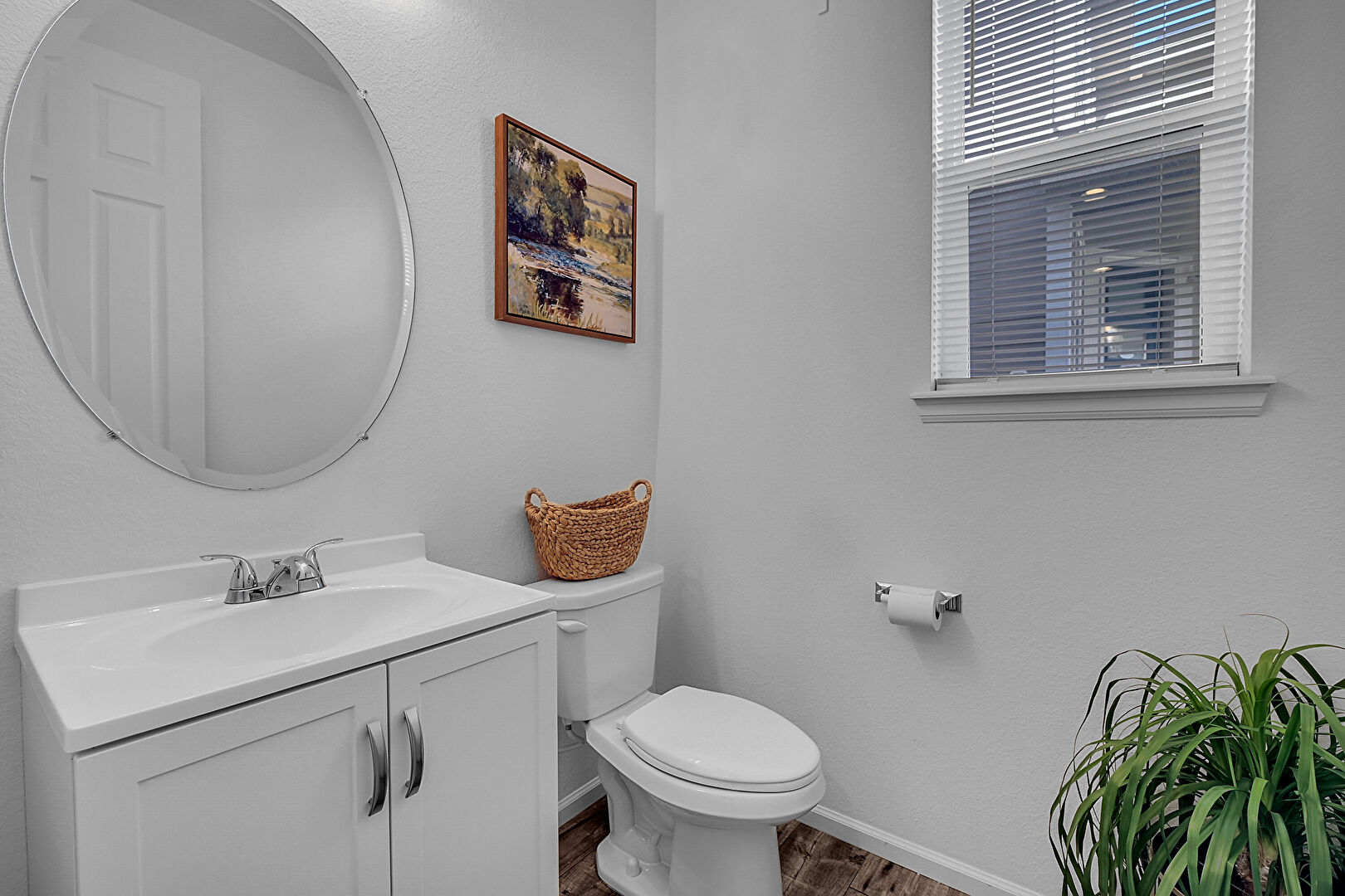 Baseboards Wall, Half Bathroom, Natural Light, Textured Wall, Vanity, Wood Finish Floor