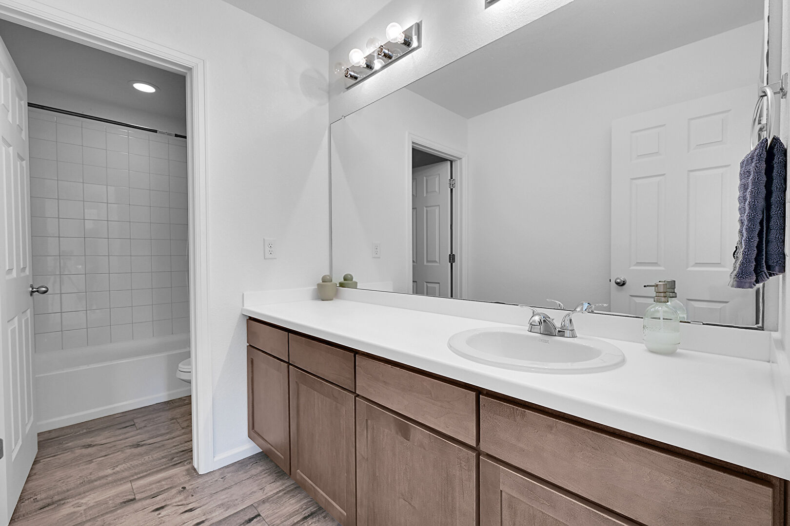 Baseboards Wall, Combined Bath Shower, Drywall, Full Bathroom, Recessed Lighting, Wood Finish Floor, Vanity