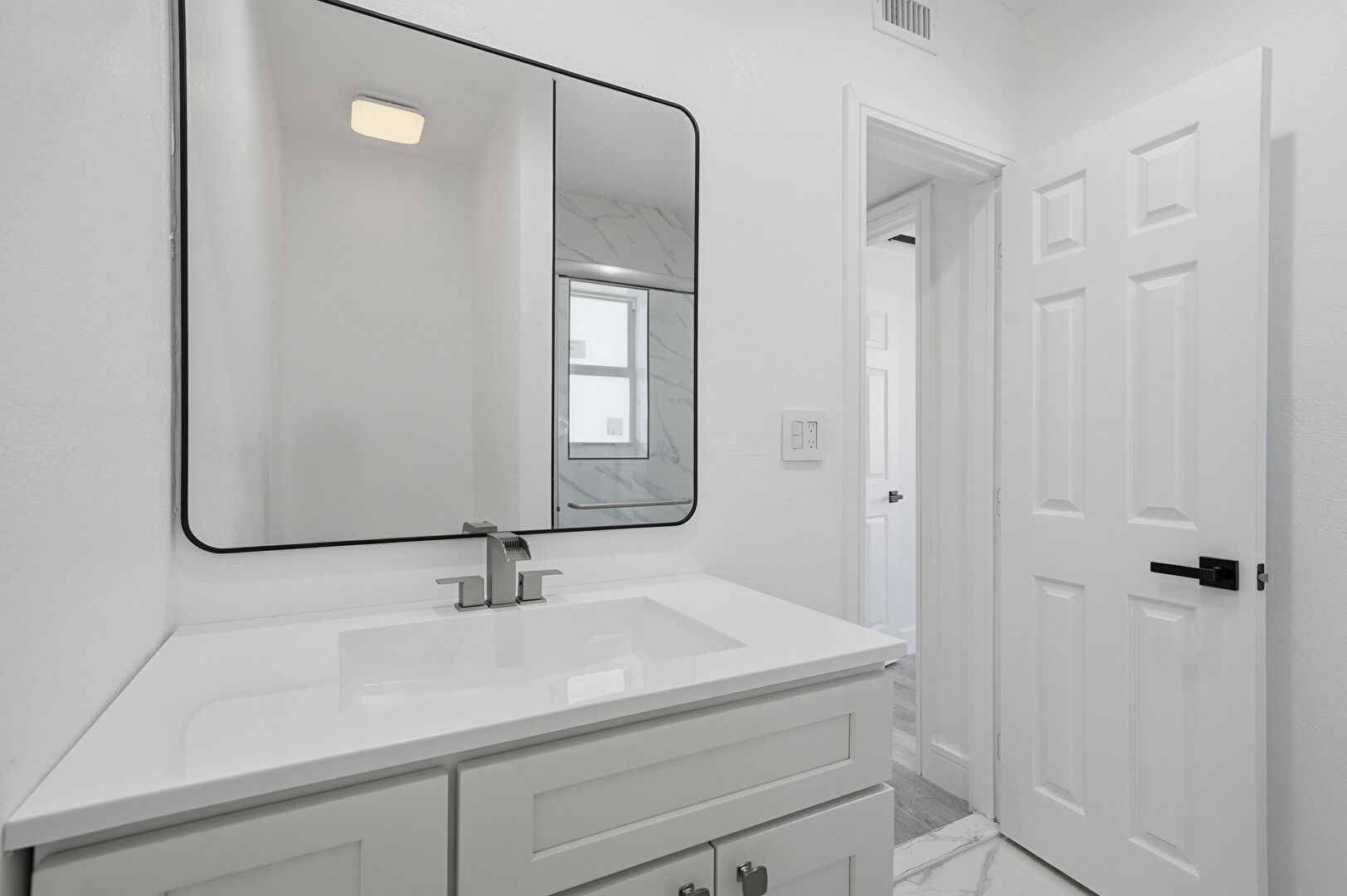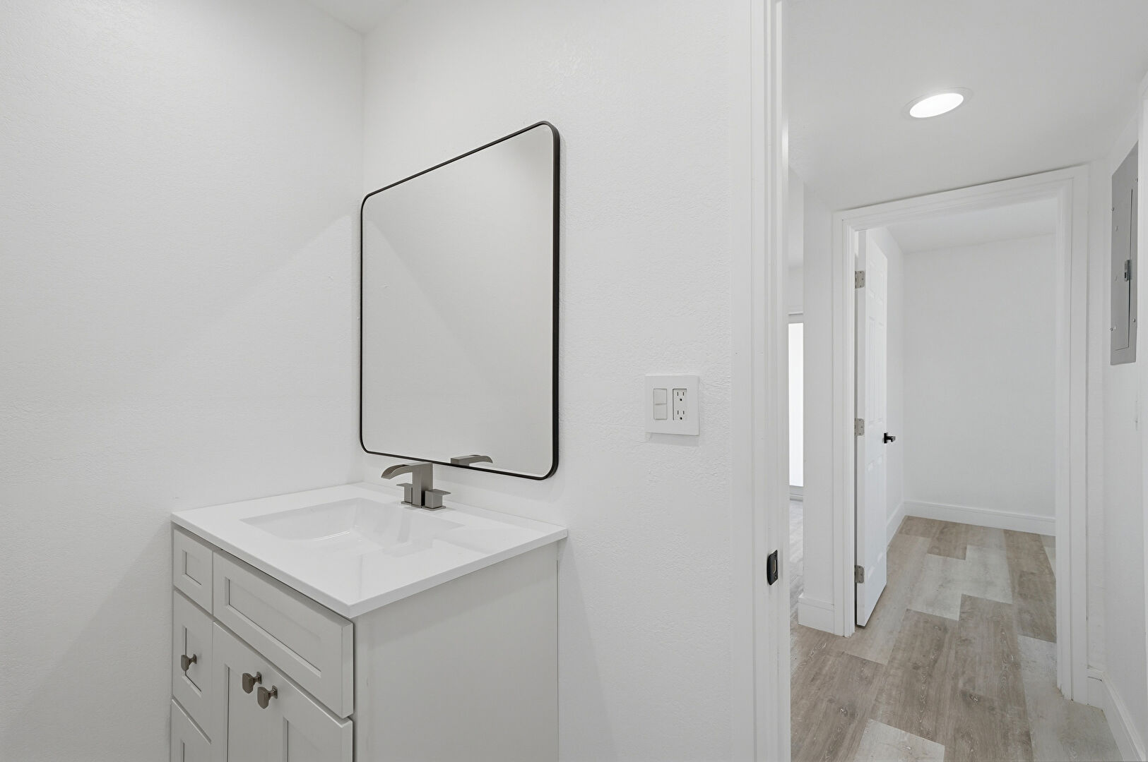 Baseboards Wall, Drywall, Electric Panel, Half Bathroom, Marble Finish Floor, Natural Light, Recessed Lighting, Vanity, Vent, Full Bathroom, Wood Finish Floor