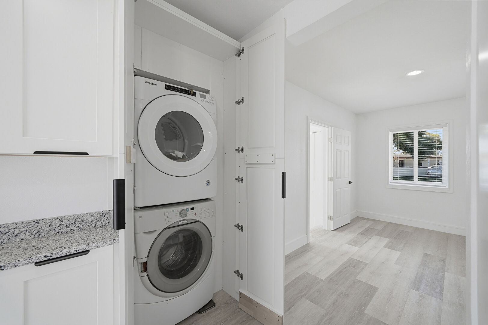 Baseboards Wall, Drywall, Laundry, Recessed Lighting, Wood Finish Floor, Natural Light