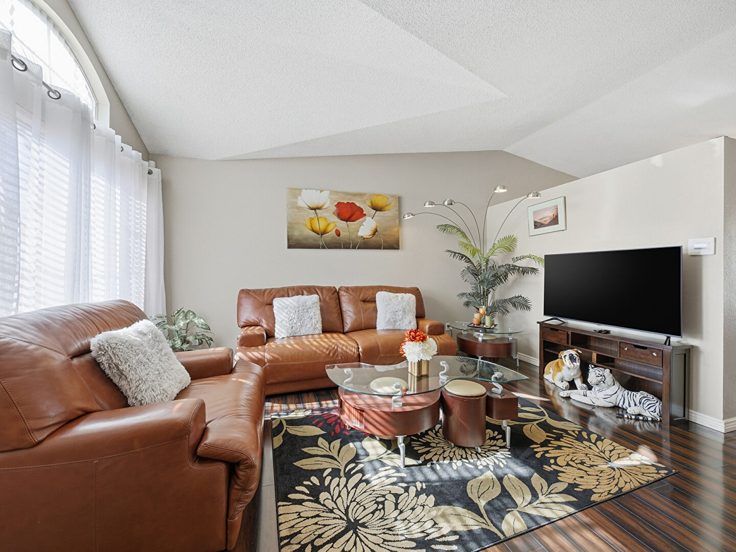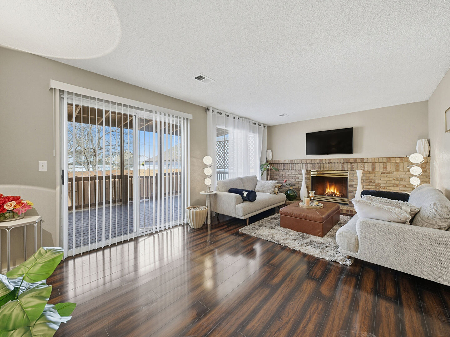 Baseboards Wall, Drywall, Fireplace, Natural Light, Notable Chandelier, Stairs, Textured Ceiling, Vaulted Ceiling, Vent, Wood Finish Floor, Baseboards Wall, Fireplace, Natural Light, Recessed Lighting, Textured Ceiling, Vaulted Ceiling, Wood Finish Floor