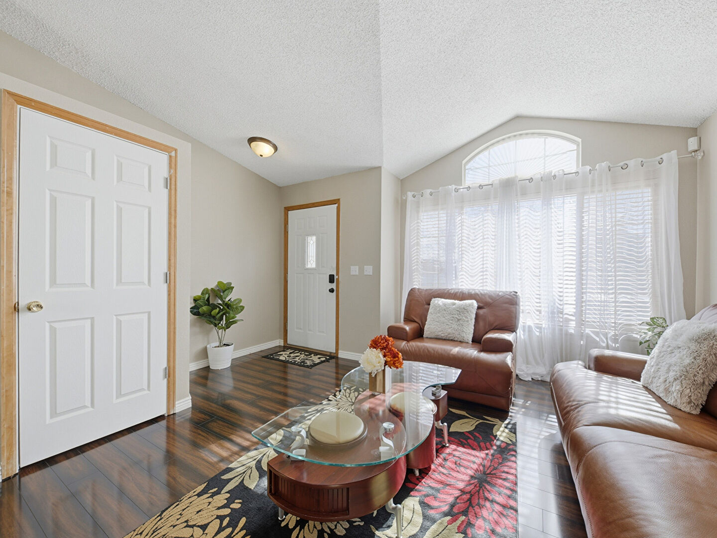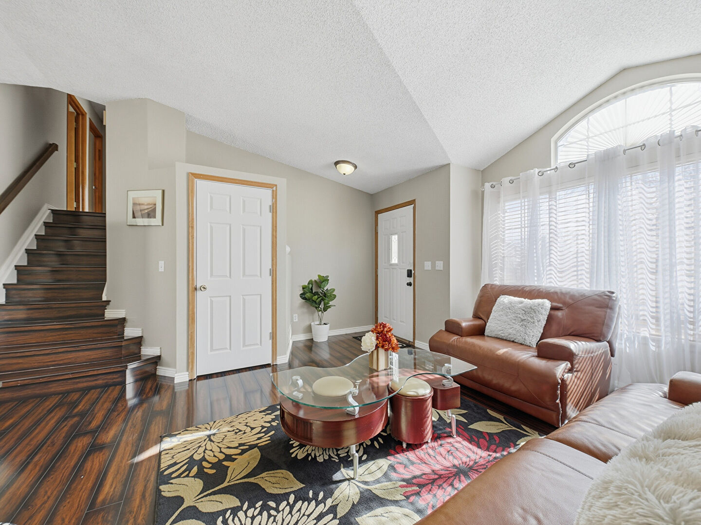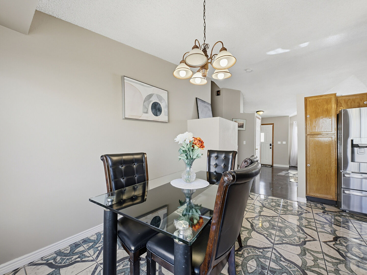 Baseboards Wall, Drywall, Natural Light, Notable Chandelier, Stairs, Textured Ceiling, Tile Floor, Vaulted Ceiling, Textured Ceiling, Wood Finish Floor