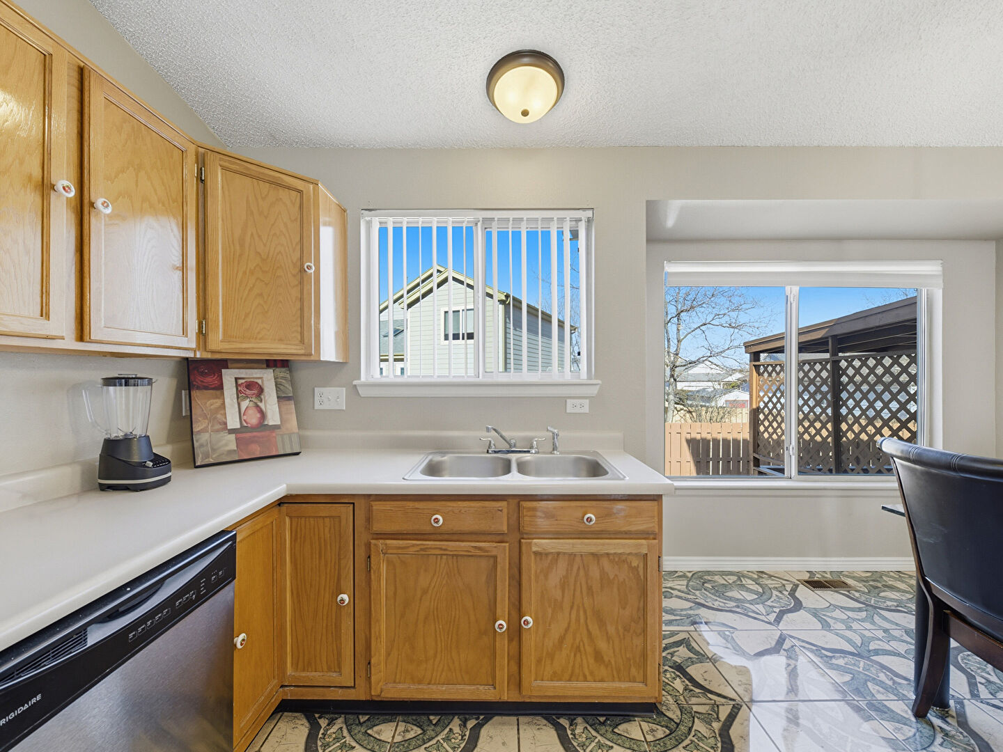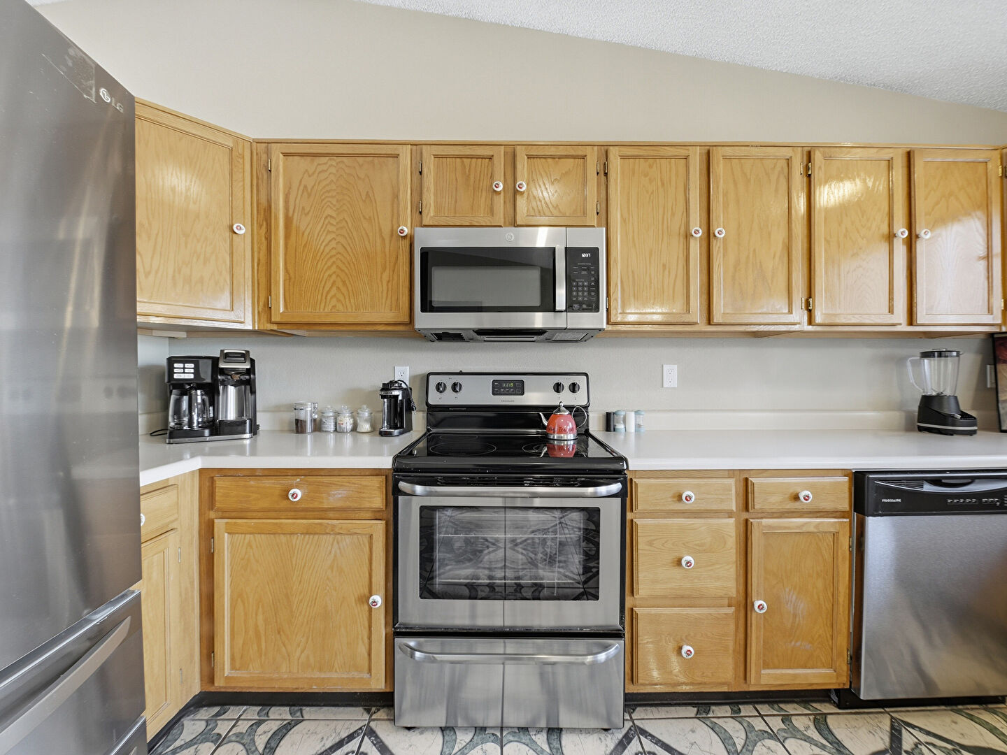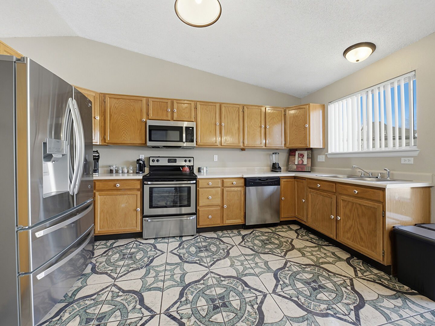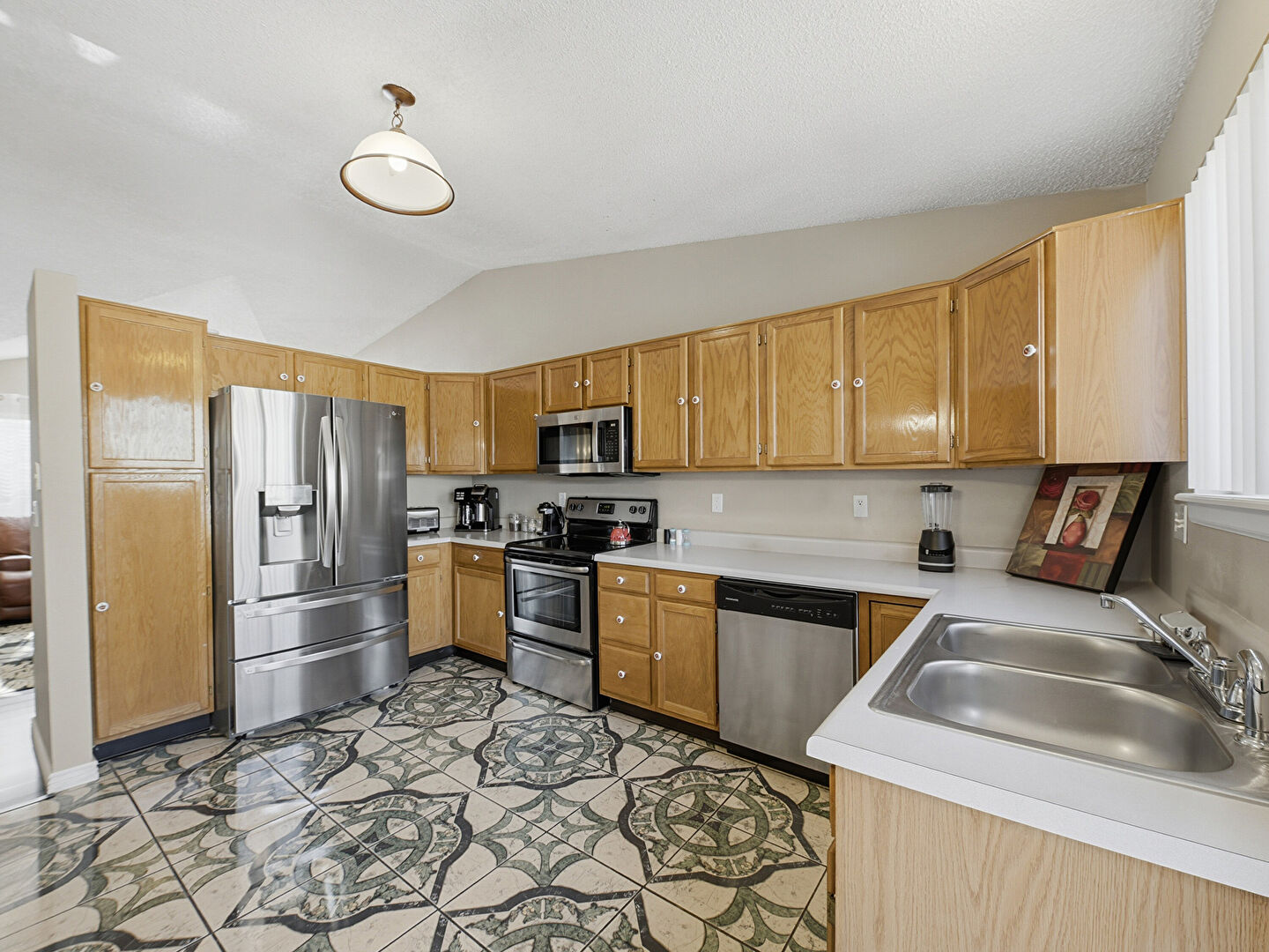 Baseboards Wall, Drywall, Medium Brown Cabinets, Natural Light, Notable Chandelier, Pendant Lighting, Raised Cabinets, Recessed Lighting, Shaker Cabinets, Textured Ceiling, Tile Floor, U Shaped Kitchen, Vaulted Ceiling, Visible Hinge Cabinets, Baseboards Wall, Textured Ceiling, Tile Floor, Vaulted Ceiling, Visible Hinge Cabinets