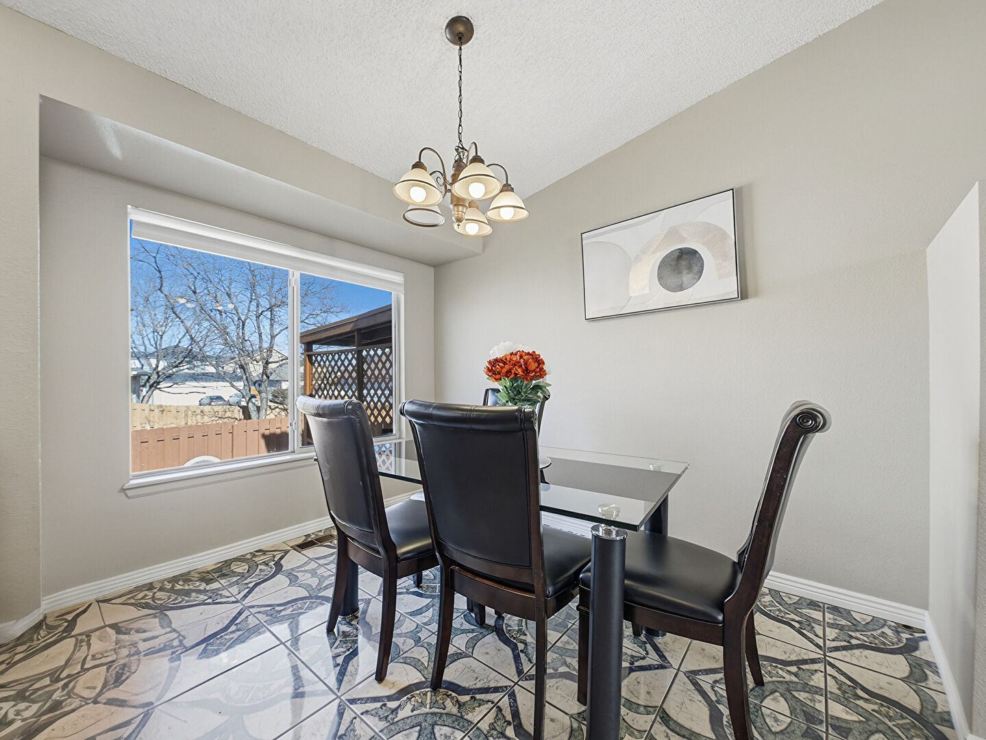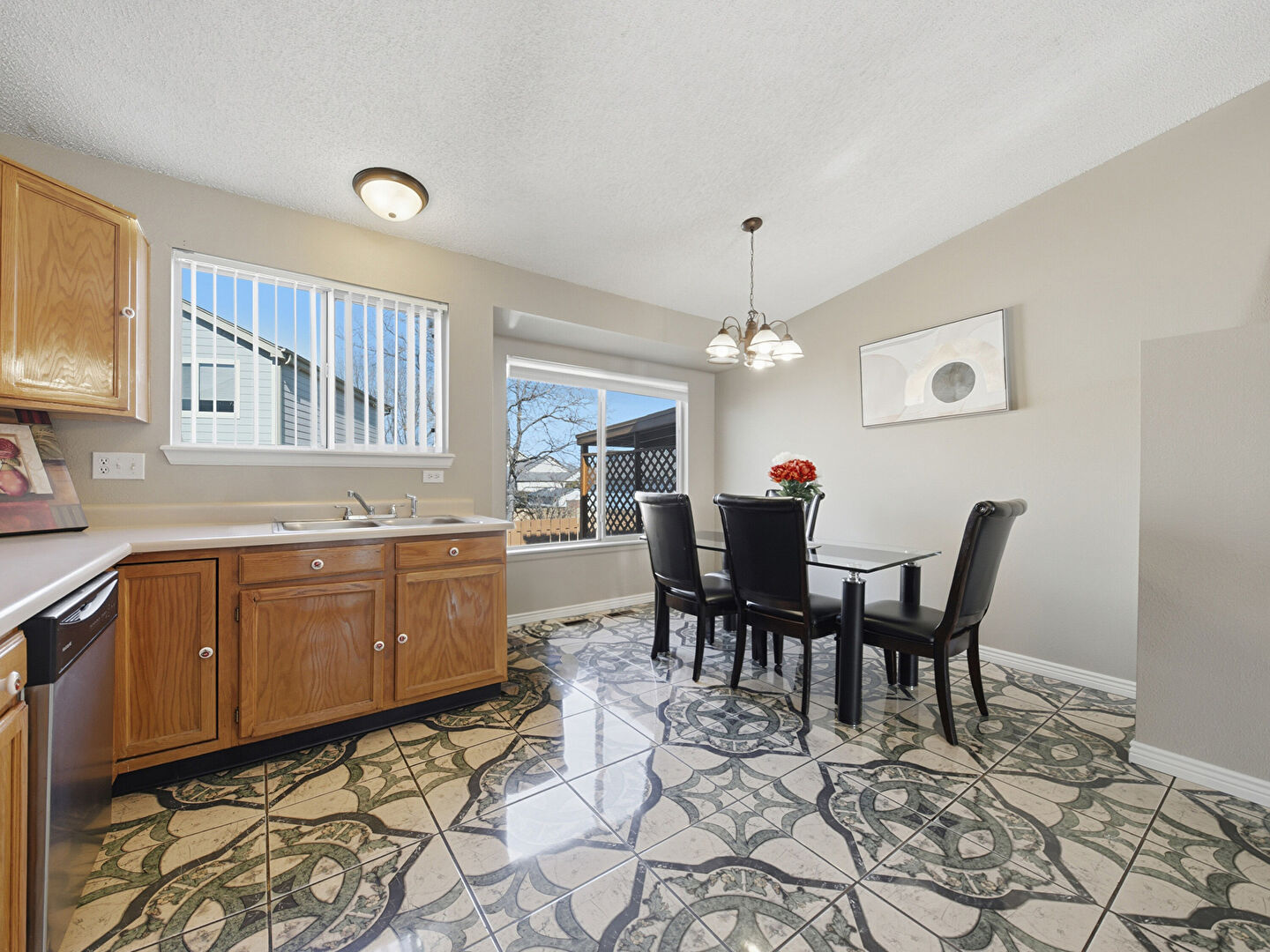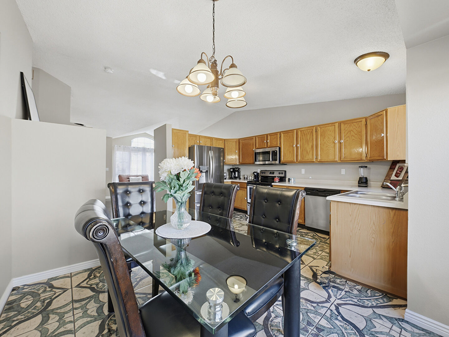 Baseboards Wall, Drywall, Natural Light, Notable Chandelier, Textured Ceiling, Tile Floor, U Shaped Kitchen, Vaulted Ceiling, Baseboards Wall, Notable Chandelier