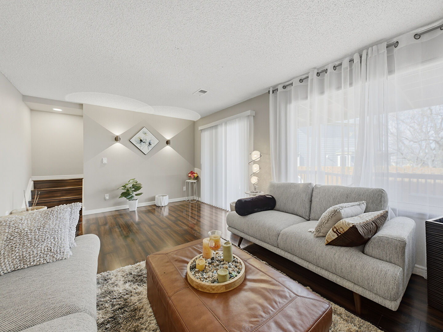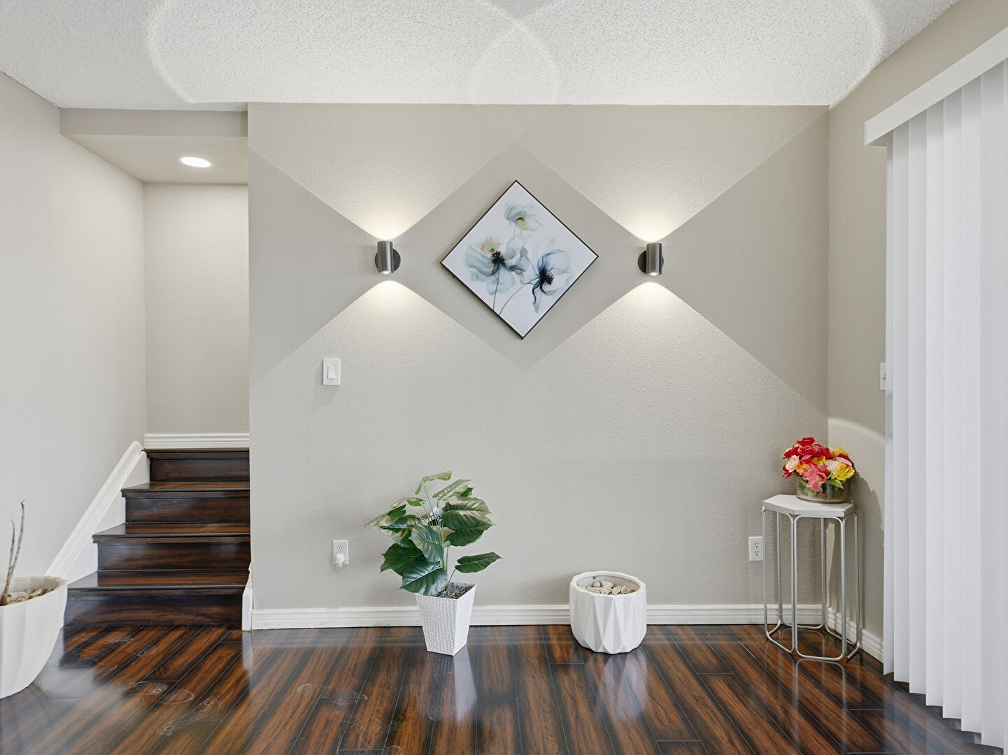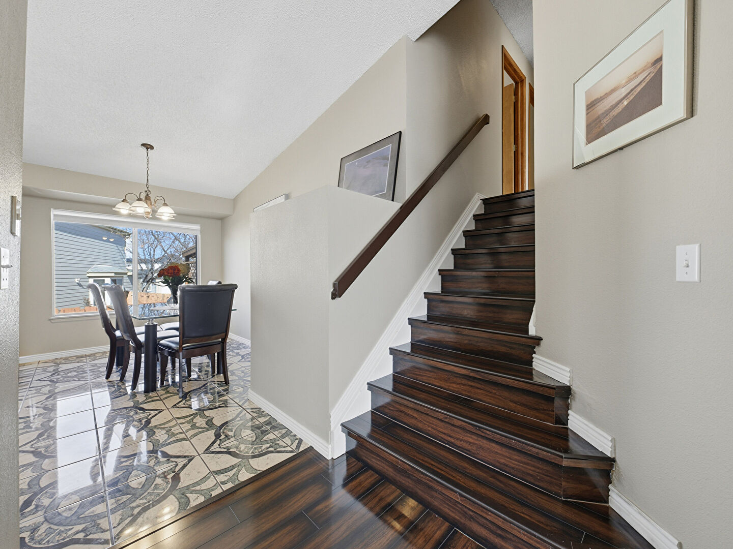 Baseboards Wall, Drywall, Natural Light, Notable Chandelier, Stairs, Wood Finish Floor