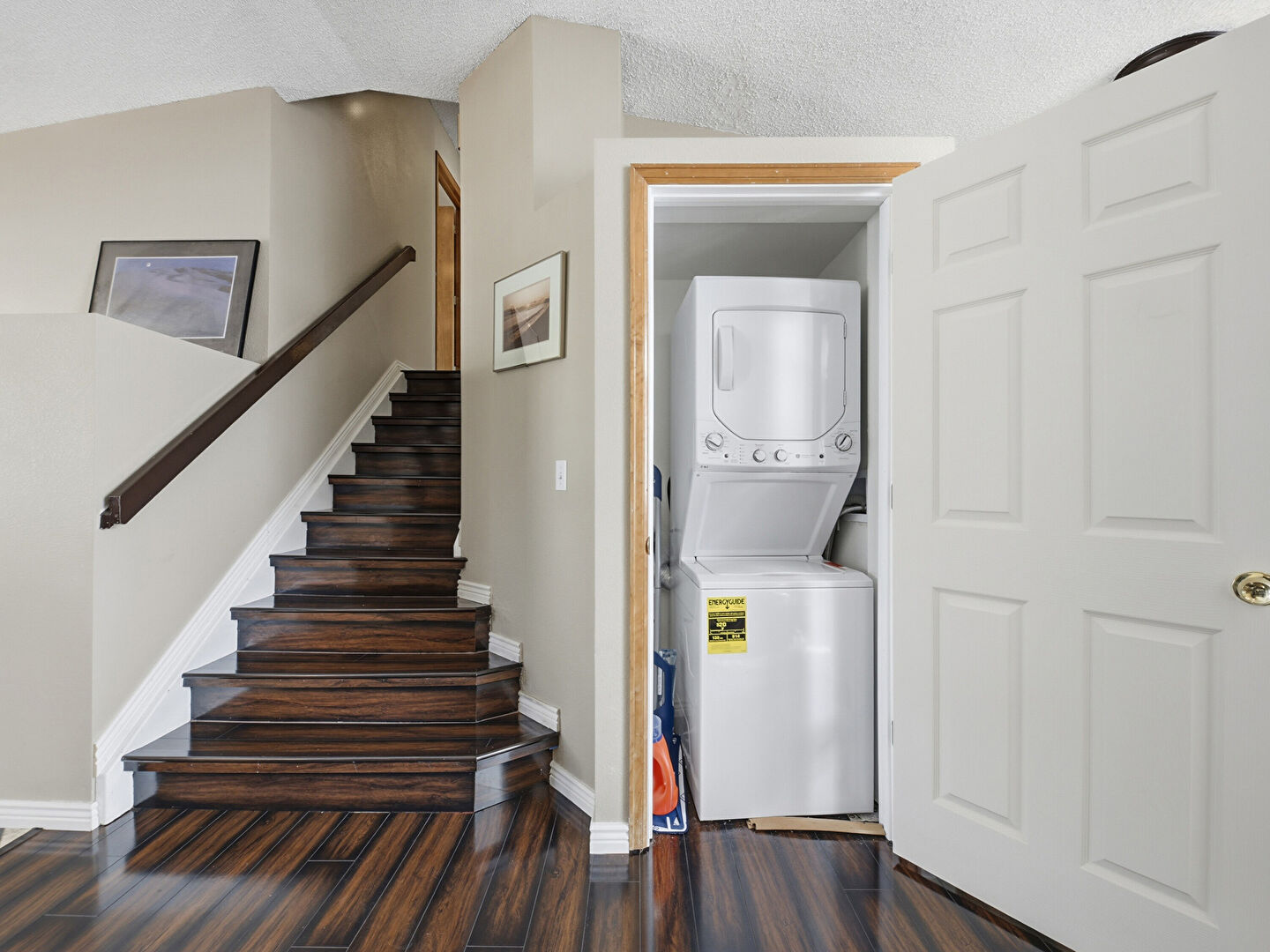 Drywall, Laundry, Textured Ceiling, Wood Finish Floor, Baseboards Wall