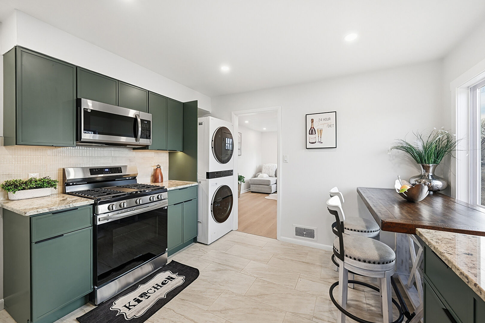 Baseboards Wall, Drywall, Green Cabinets, Kitchen Bar, Kitchen Peninsula, Laundry, Marble Finish Floor, Natural Light, Recessed Lighting, Shaker Cabinets, Stone Countertops, Vent, Marble Finish Floor, Natural Light, Vent