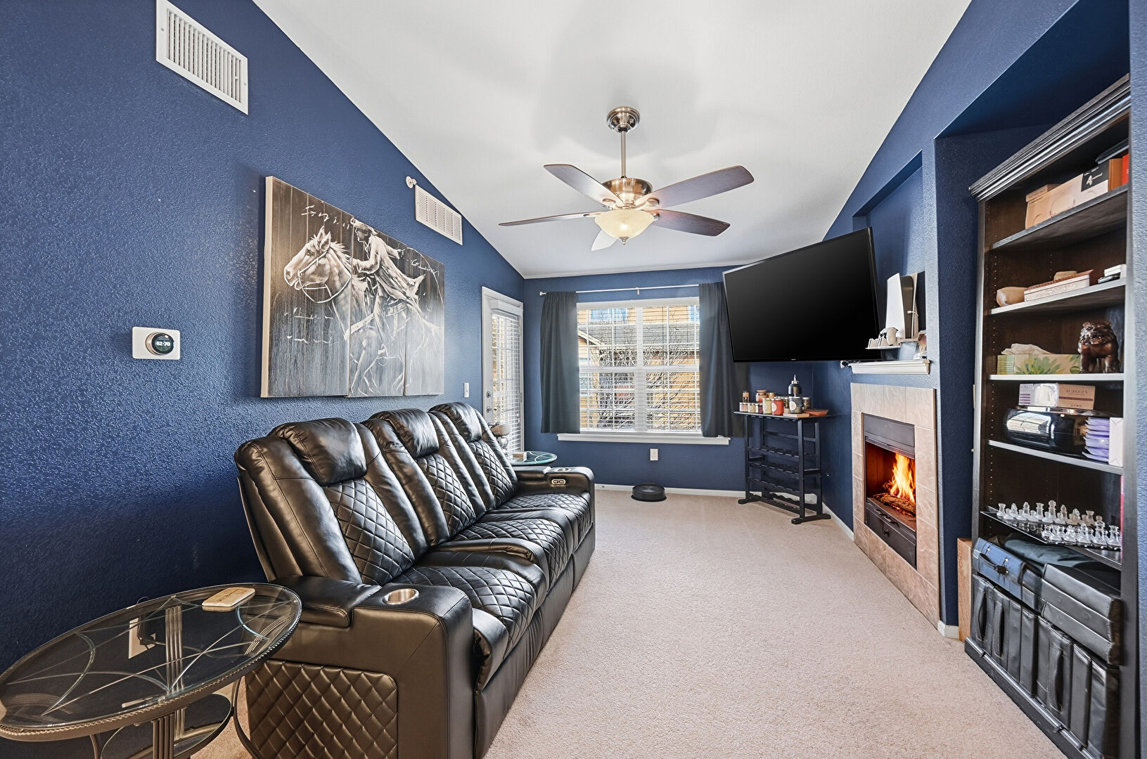 Baseboards Wall, Built In Shelves, Carpet, Ceiling Fan, Drywall, Fireplace, Natural Light, Textured Wall, Vaulted Ceiling, Notable Chandelier, Vent