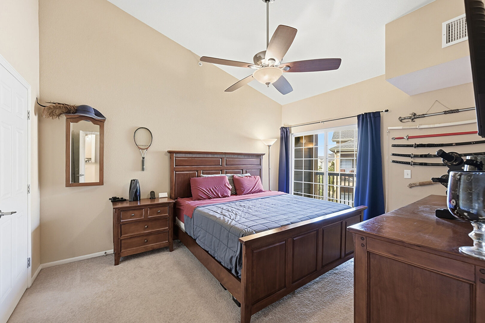Access To Exterior, Baseboards Wall, Carpet, Ceiling Fan, Drywall, High Ceiling, Vaulted Ceiling, Vent, Ceiling Fan, Natural Light