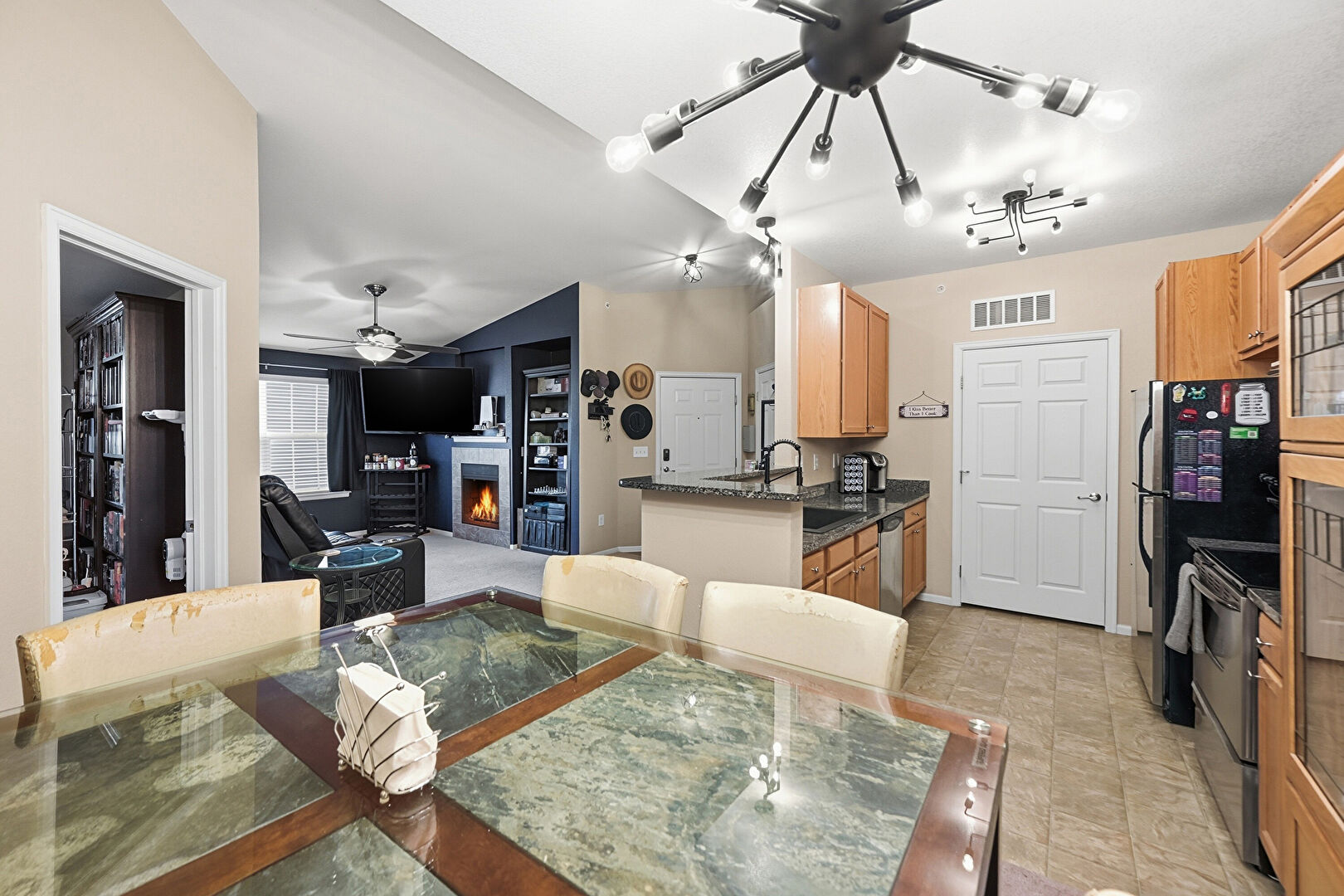 Arched Walkways, Baseboards Wall, Carpet, Ceiling Fan, Drywall, Fireplace, Galley Kitchen, Kitchen Peninsula, Medium Brown Cabinets, Notable Chandelier, Opens To Living Area, Pendant Lighting, Shaker Cabinets, Stone Countertops, Track Lighting, U Shaped Kitchen, Vent, Vinyl Floor, Kitchen Peninsula, Medium Brown Cabinets, Notable Chandelier, Vaulted Ceiling