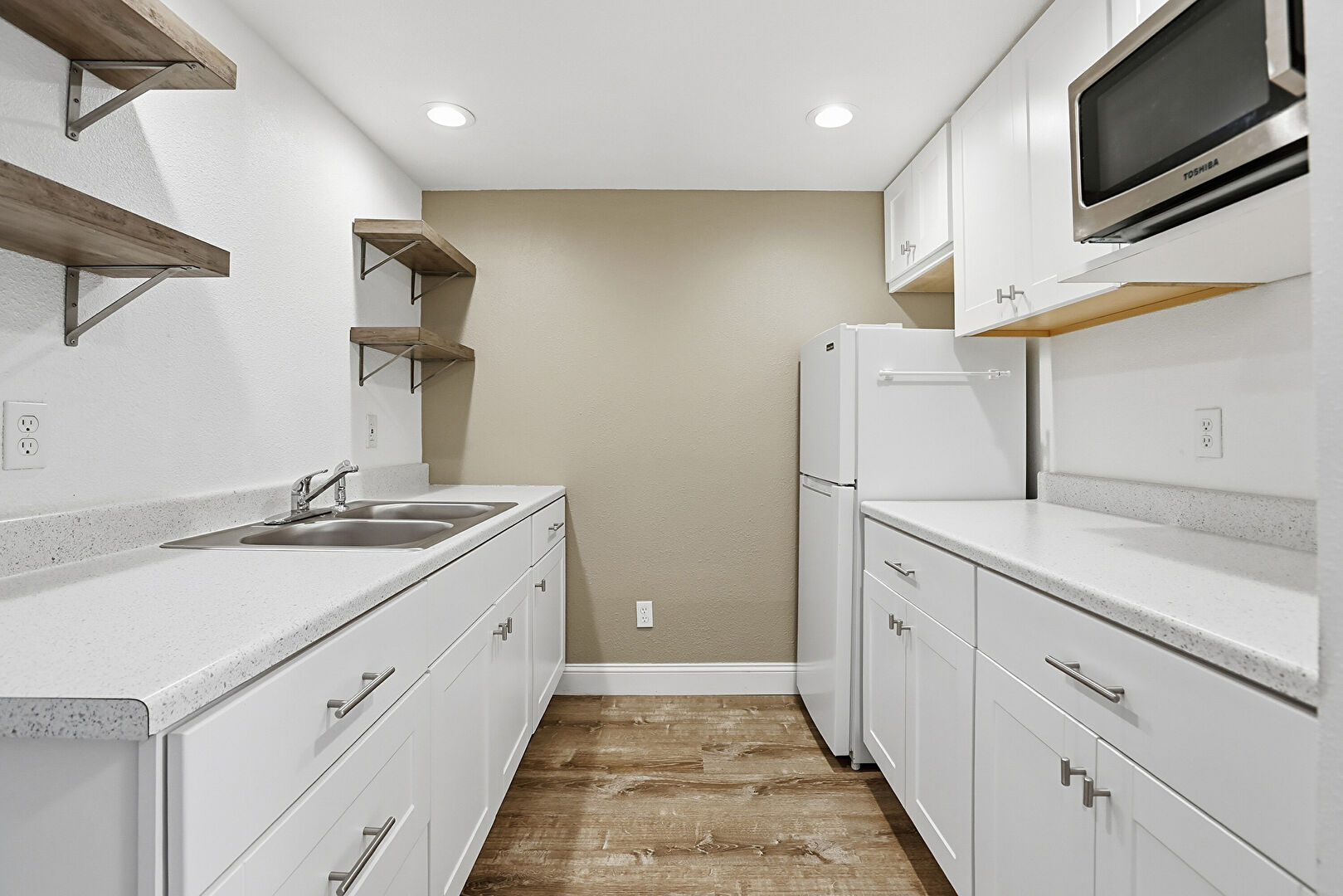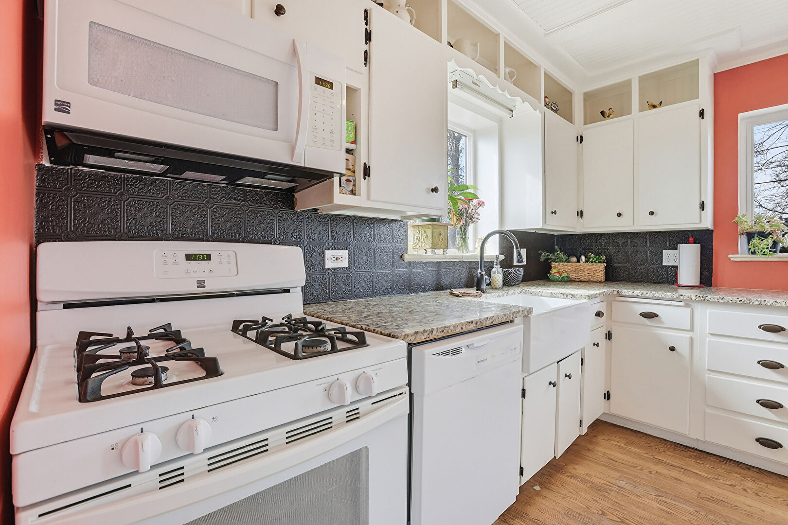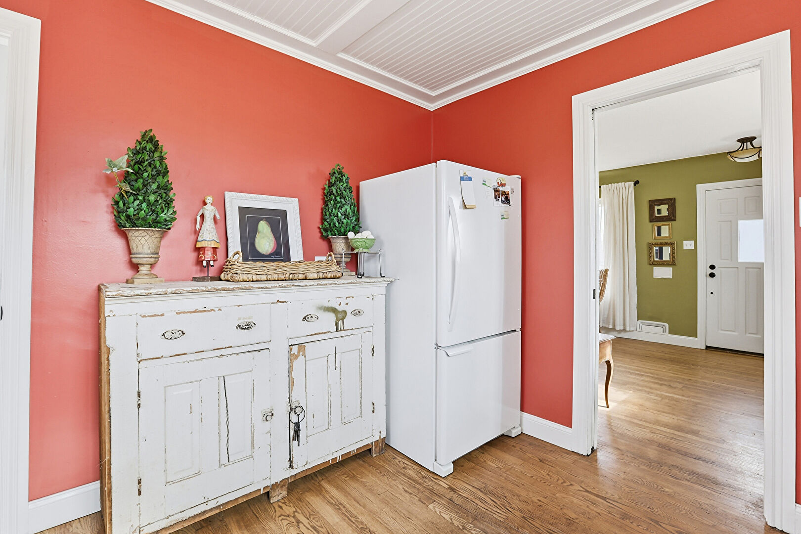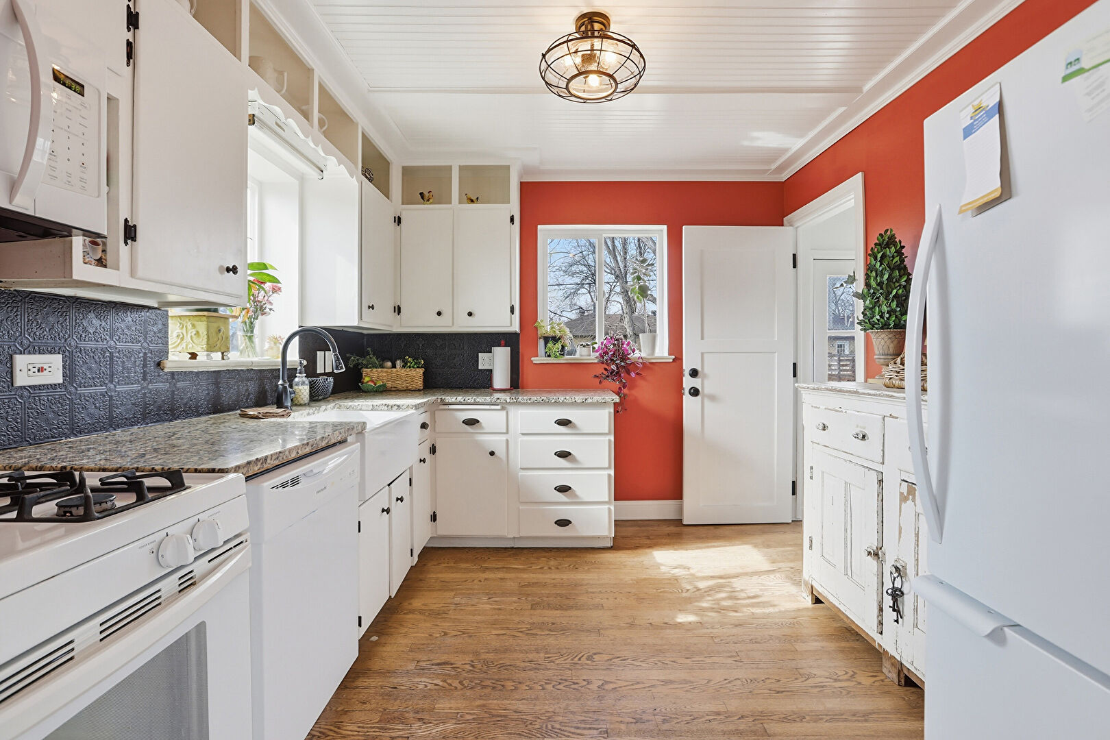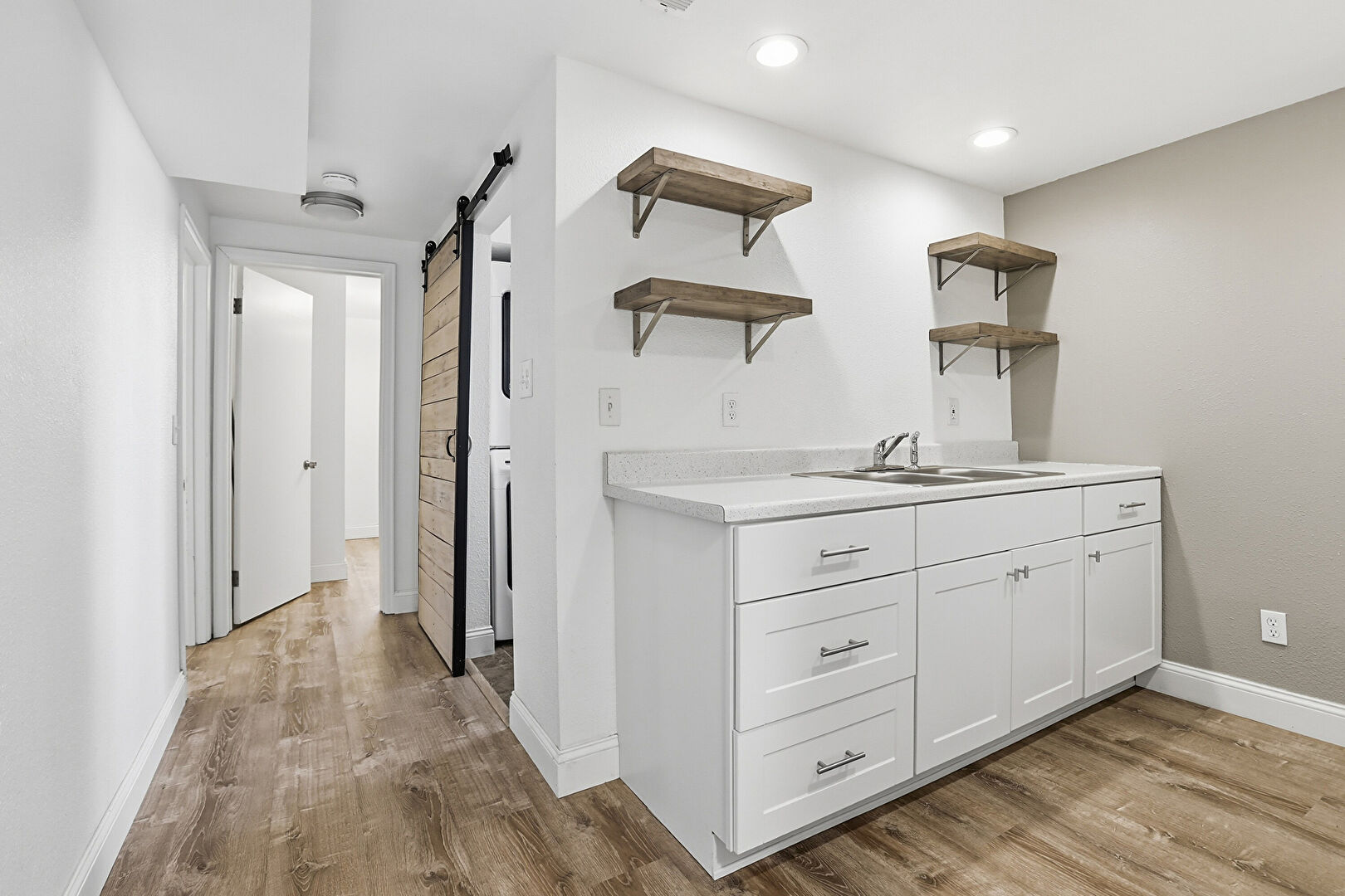 Barn Door, Baseboards Wall, Crown Molding, Drywall, Natural Light, Open Shelves, Recessed Lighting, Shaker Cabinets, Stone Countertops, Visible Hinge Cabinets, Wood Ceiling, Wood Finish Floor, Baseboards Wall, Drywall, Natural Light, Open Shelves, Recessed Lighting, Stone Countertops, Wood Finish Floor