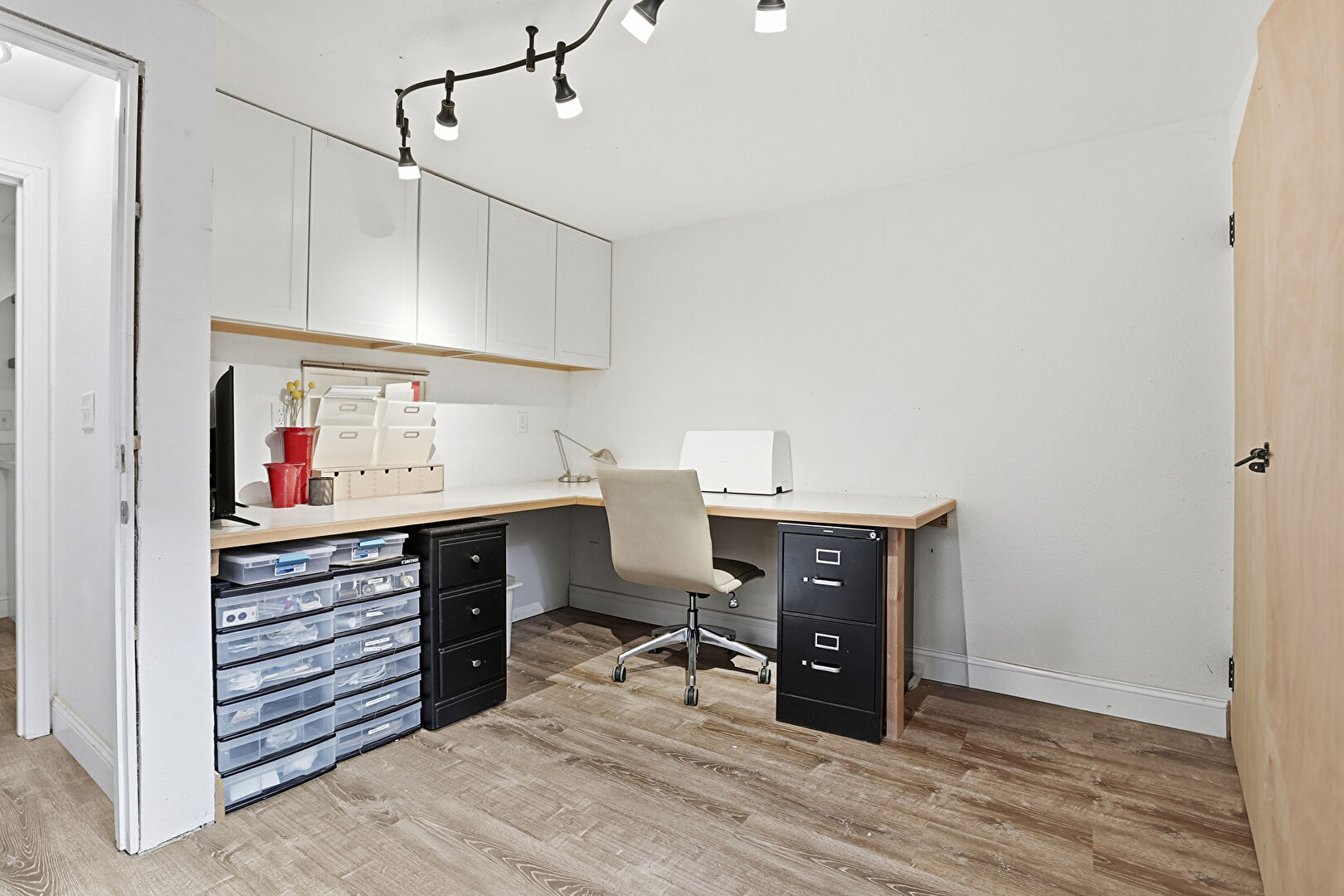 Baseboards Wall, Basement, Built In Desk, Drywall, Office Area, Track Lighting, Wood Finish Floor, Drywall, Track Lighting