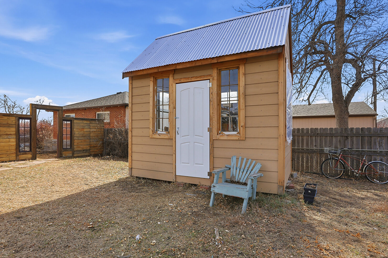 Brick Siding, Downspout, Fence, Gutters, Lawn, Outdoor Structure, Parking Pad, Shed, Shingle Roof, Stoop, Downspout, Fence