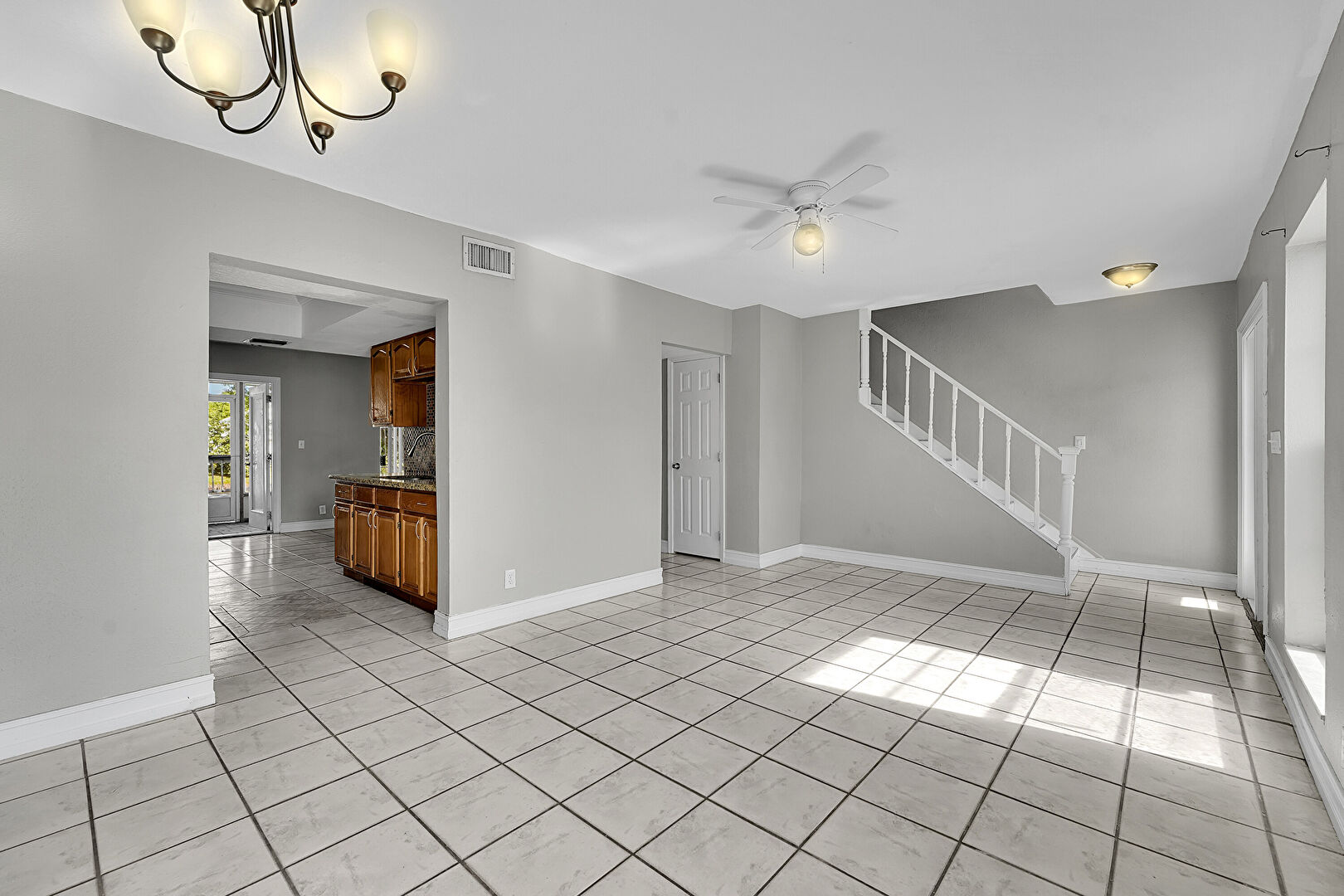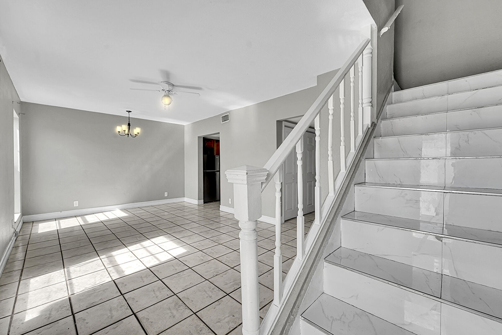 Baseboards Wall, Ceiling Fan, Drywall, Notable Chandelier, Stairs, Vent, Tile Floor