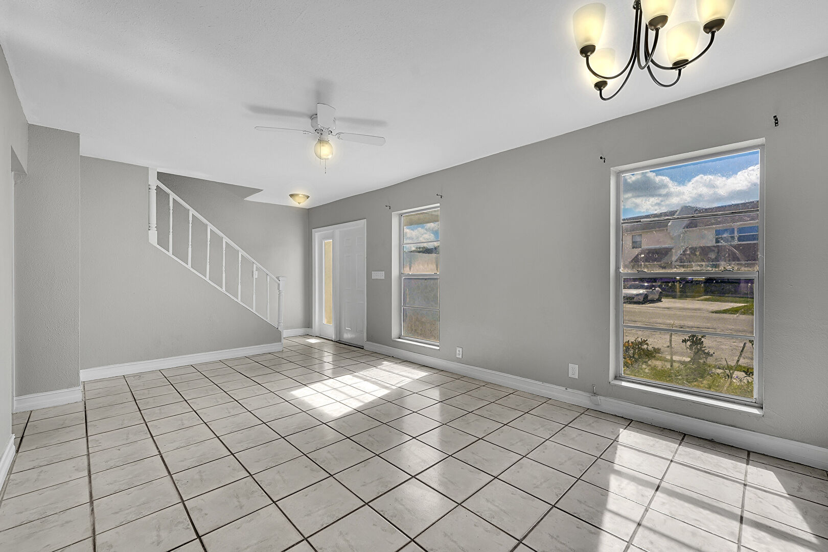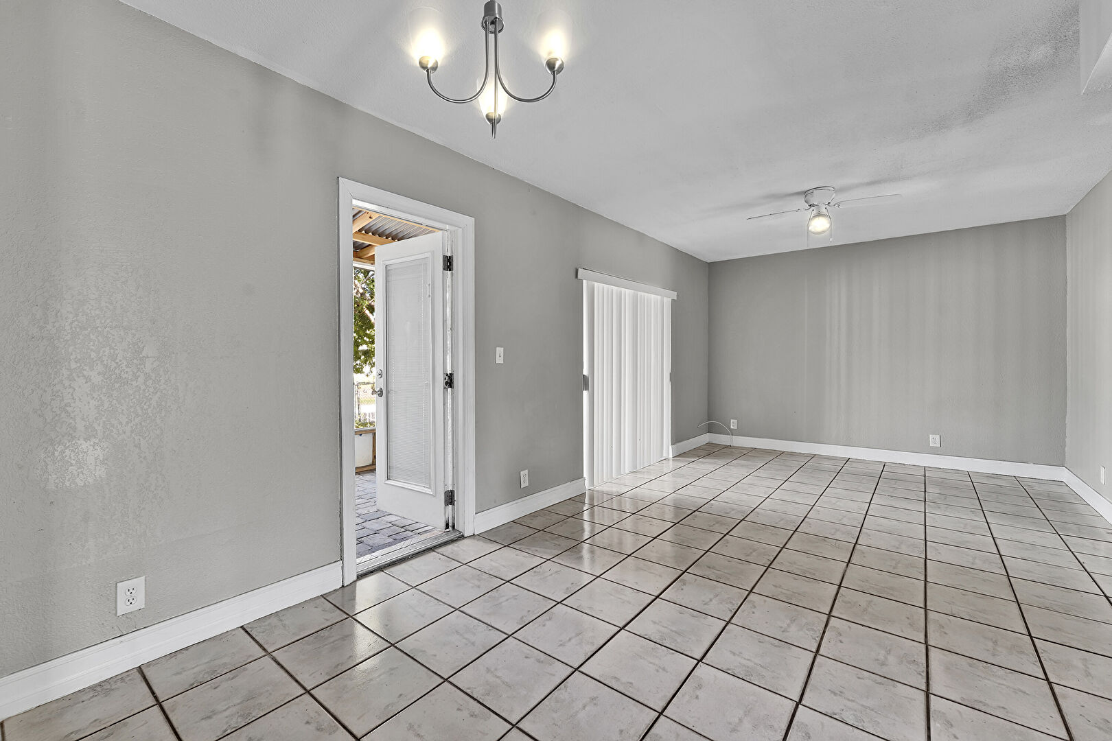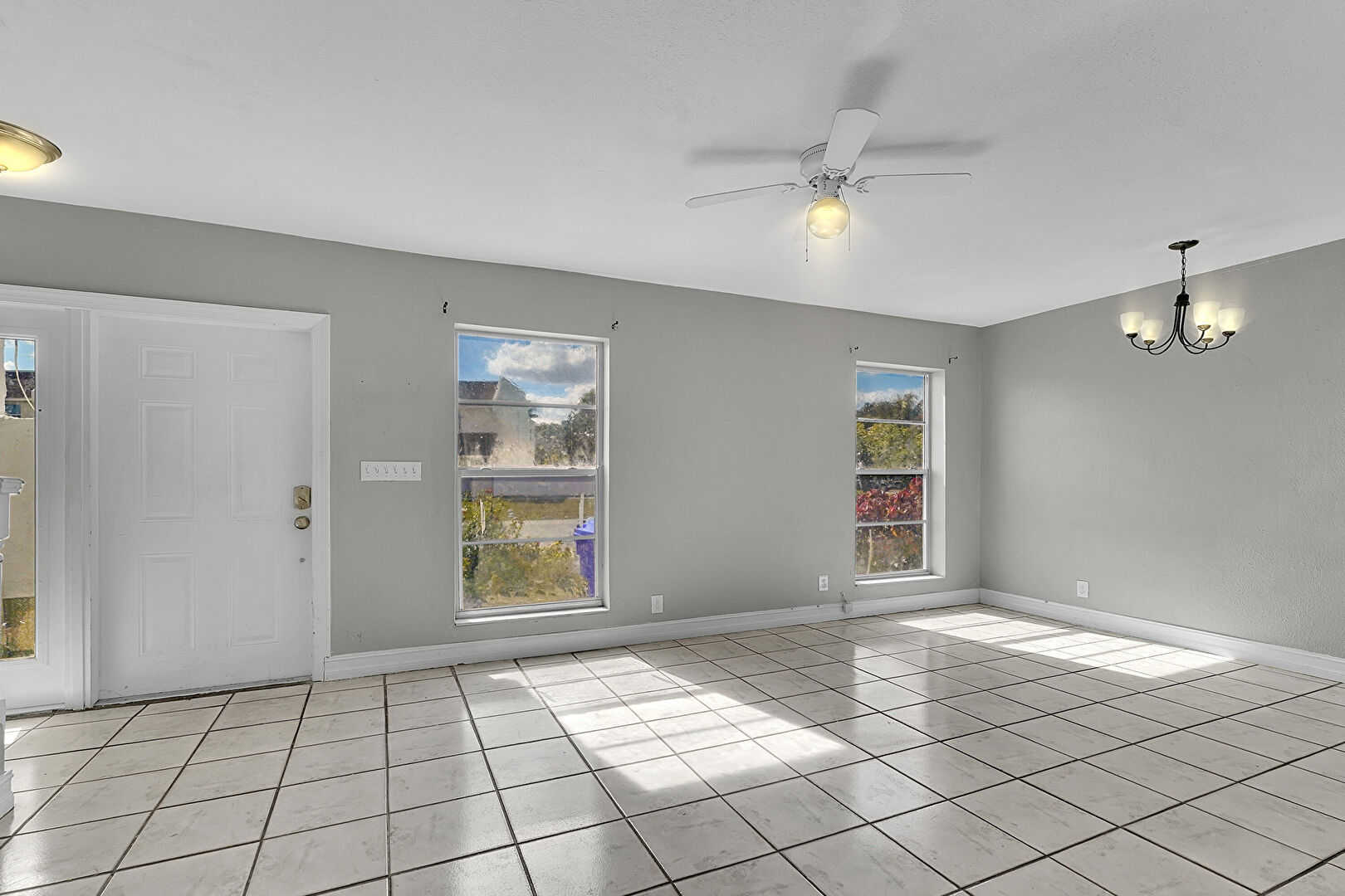 Baseboards Wall, Ceiling Fan, Natural Light, Notable Chandelier, Tile Floor, Drywall