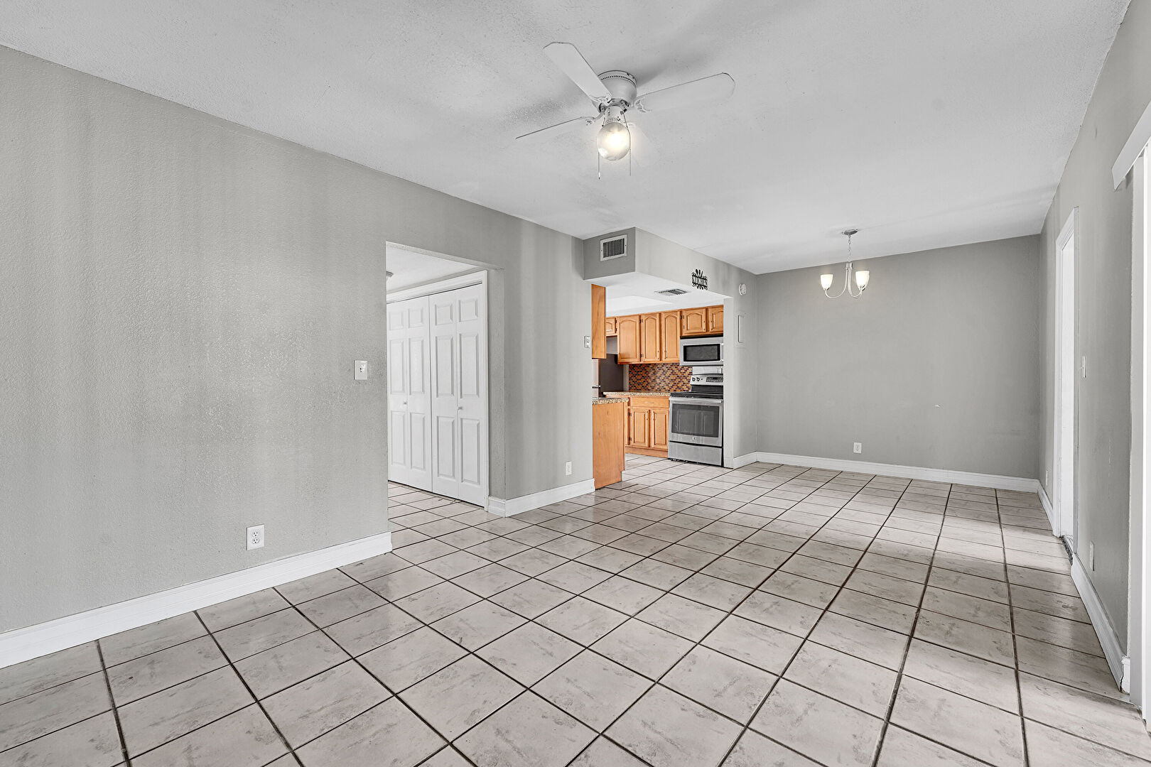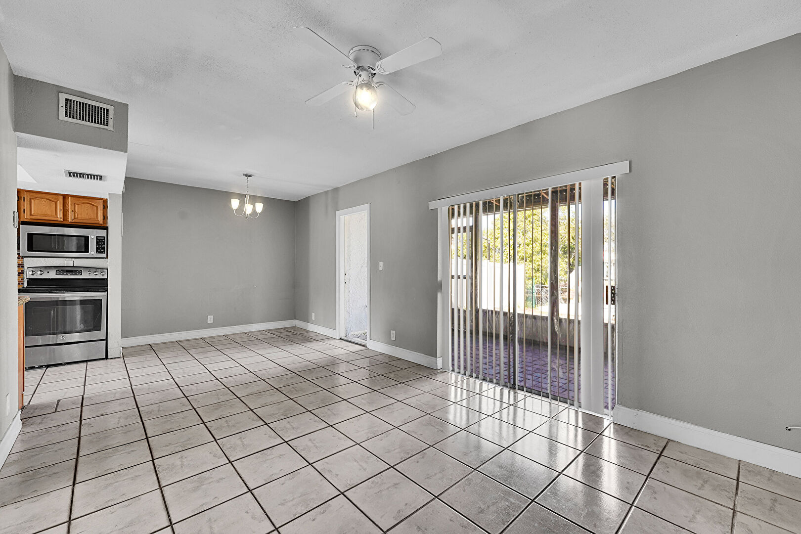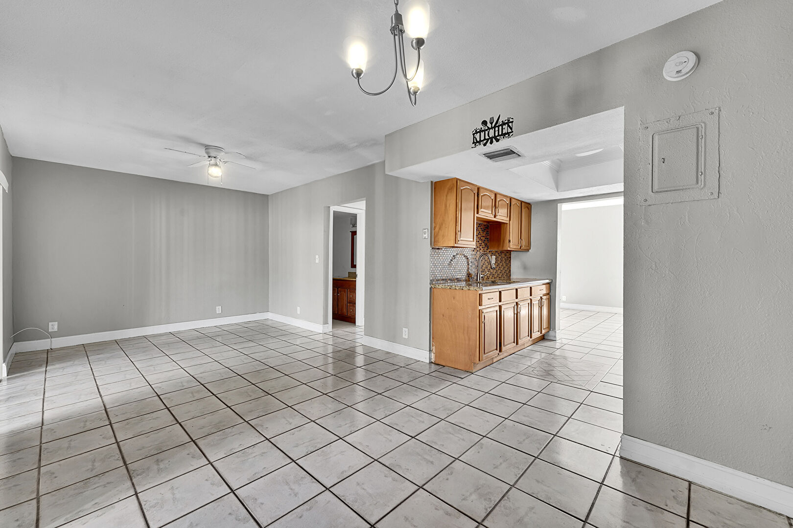 Baseboards Wall, Ceiling Fan, Natural Light, Notable Chandelier, Tile Floor, Drywall
