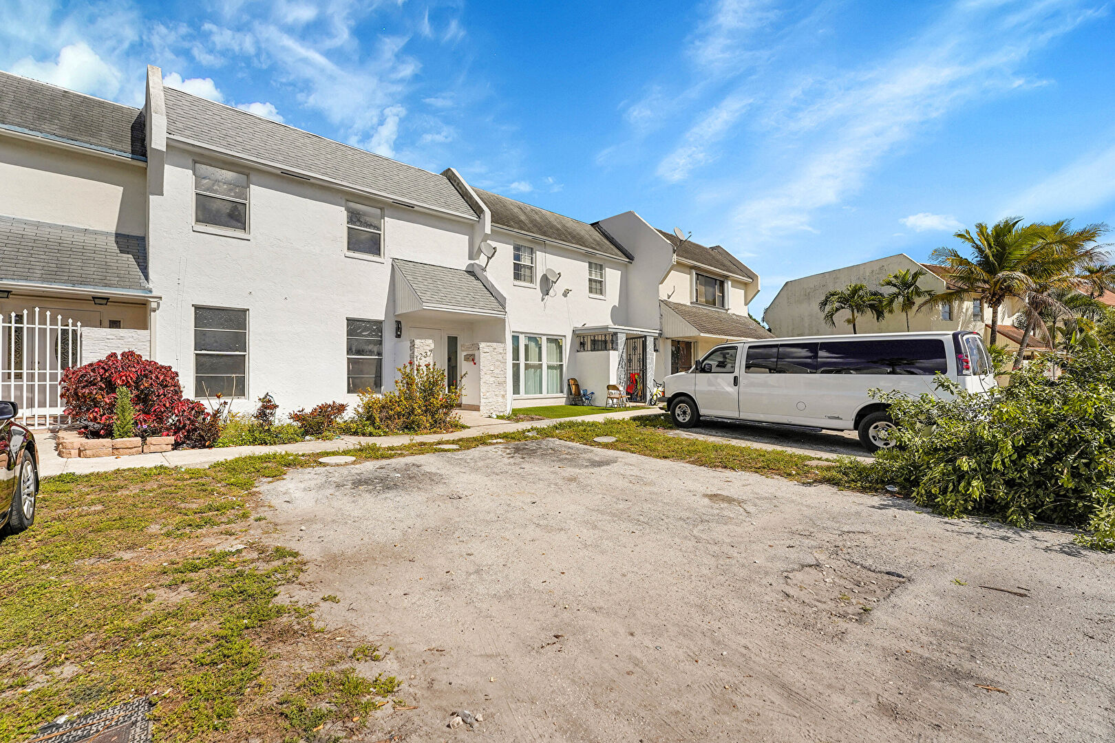 Downspout, Lawn, Parking Lot, Satellite Dish, Shingle Roof, Stucco Siding