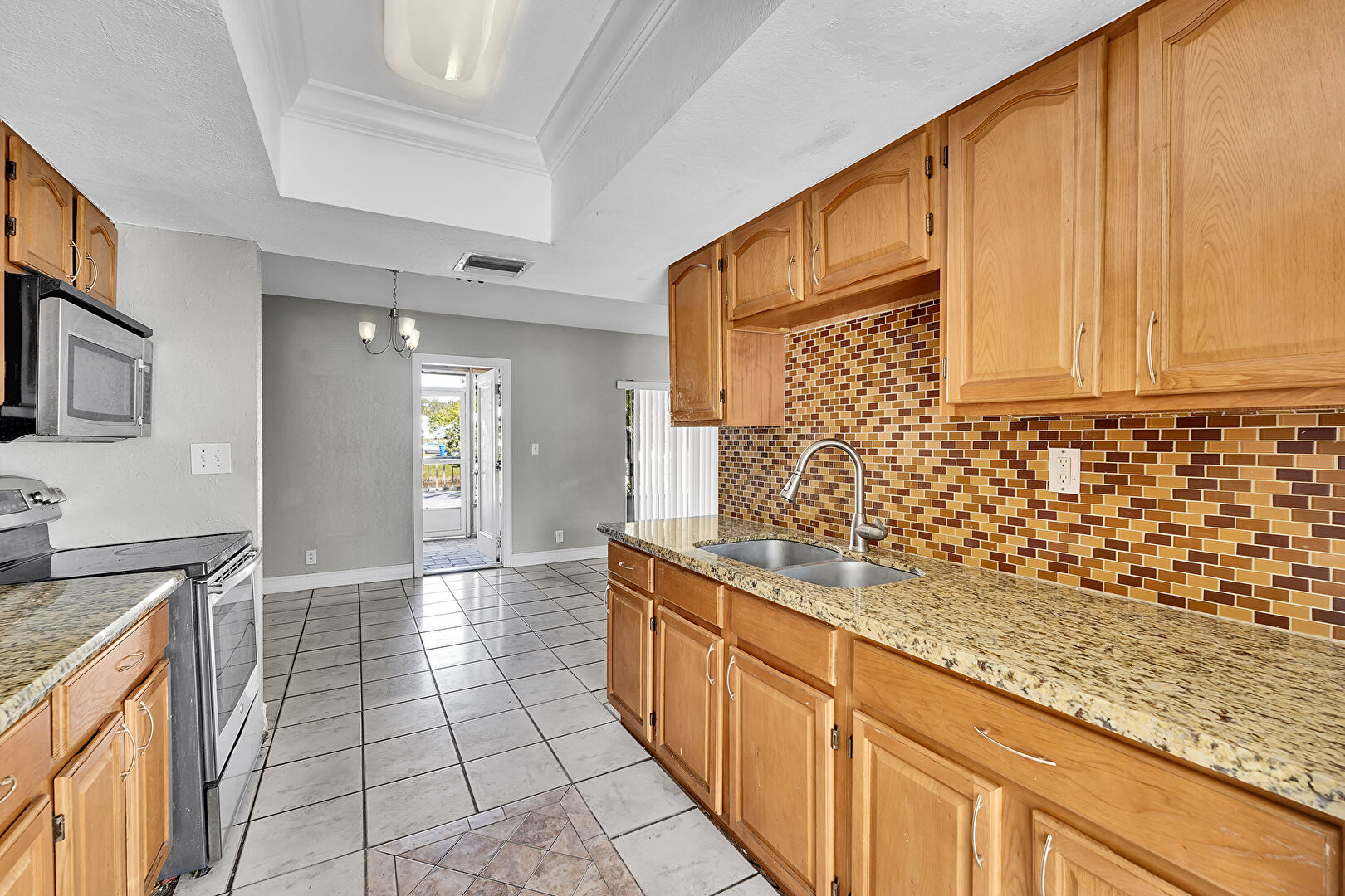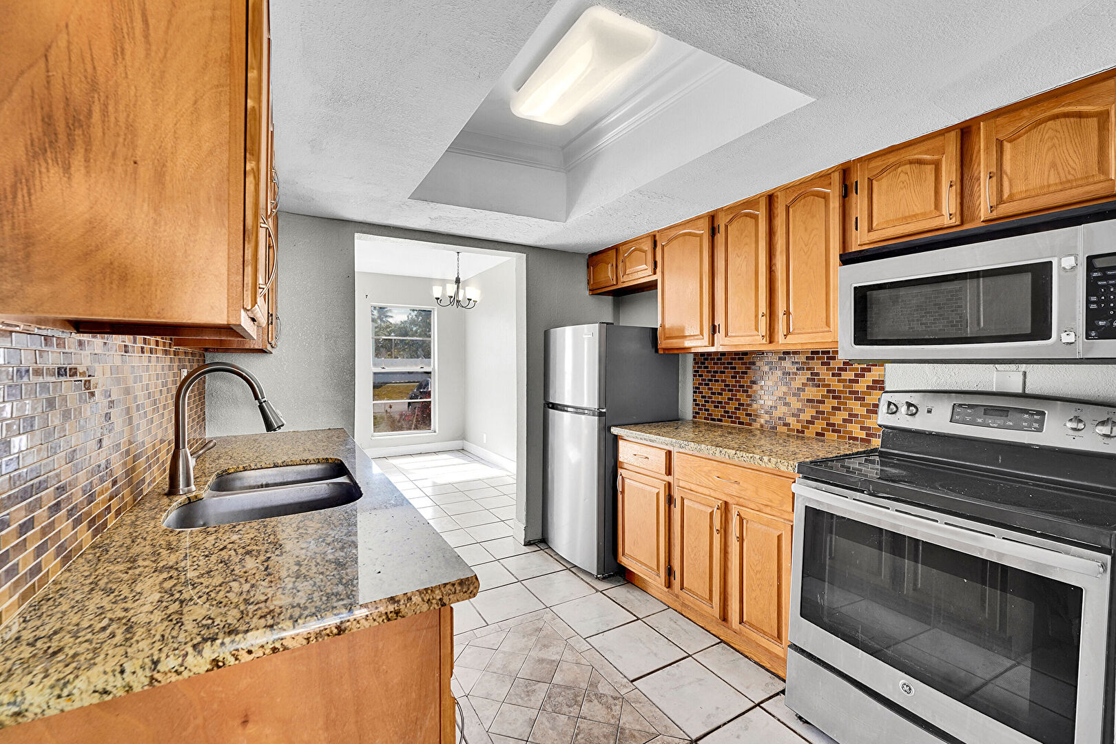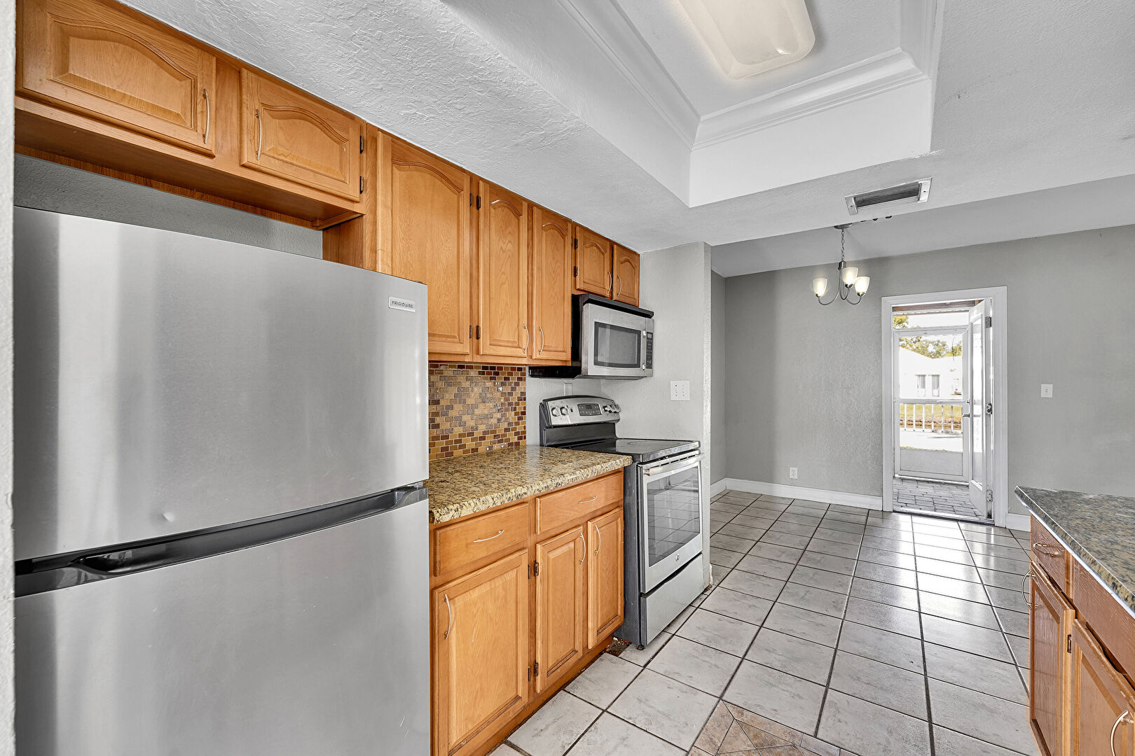 Arched Cabinets, Baseboards Wall, Crown Molding, Drywall, Galley Kitchen, Medium Brown Cabinets, Natural Light, Notable Chandelier, Pendant Lighting, Raised Cabinets, Shaker Cabinets, Stone Countertops, Textured Ceiling, Tile Floor, Tray Ceiling, Vent, Visible Hinge Cabinets, Drywall, Galley Kitchen, Natural Light, Raised Cabinets, Stone Countertops