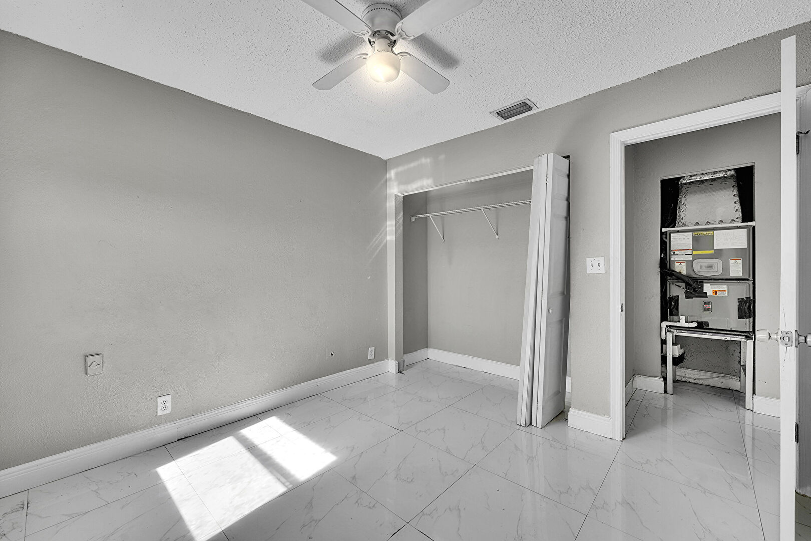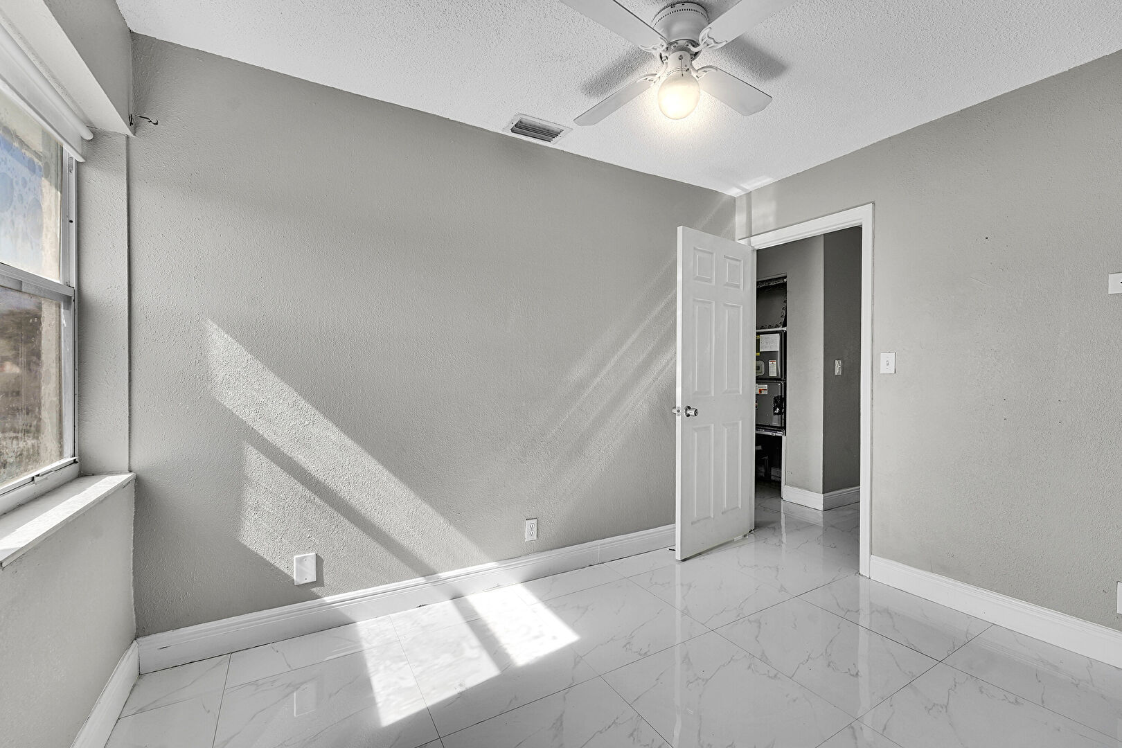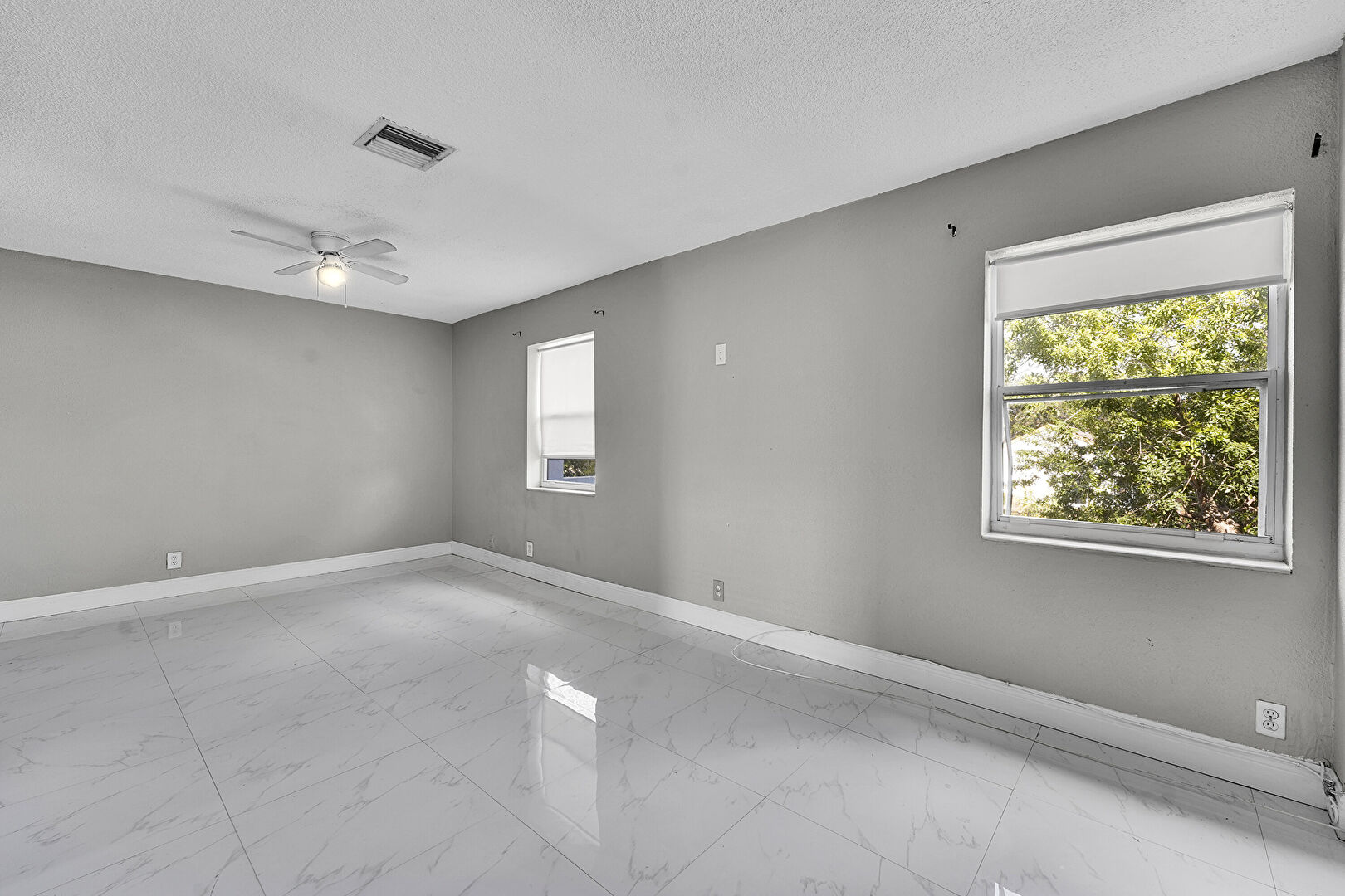 Baseboards Wall, Ceiling Fan, Drywall, Marble Finish Floor, Natural Light, Textured Ceiling, Textured Wall, Vent, Baseboards Wall, Vent