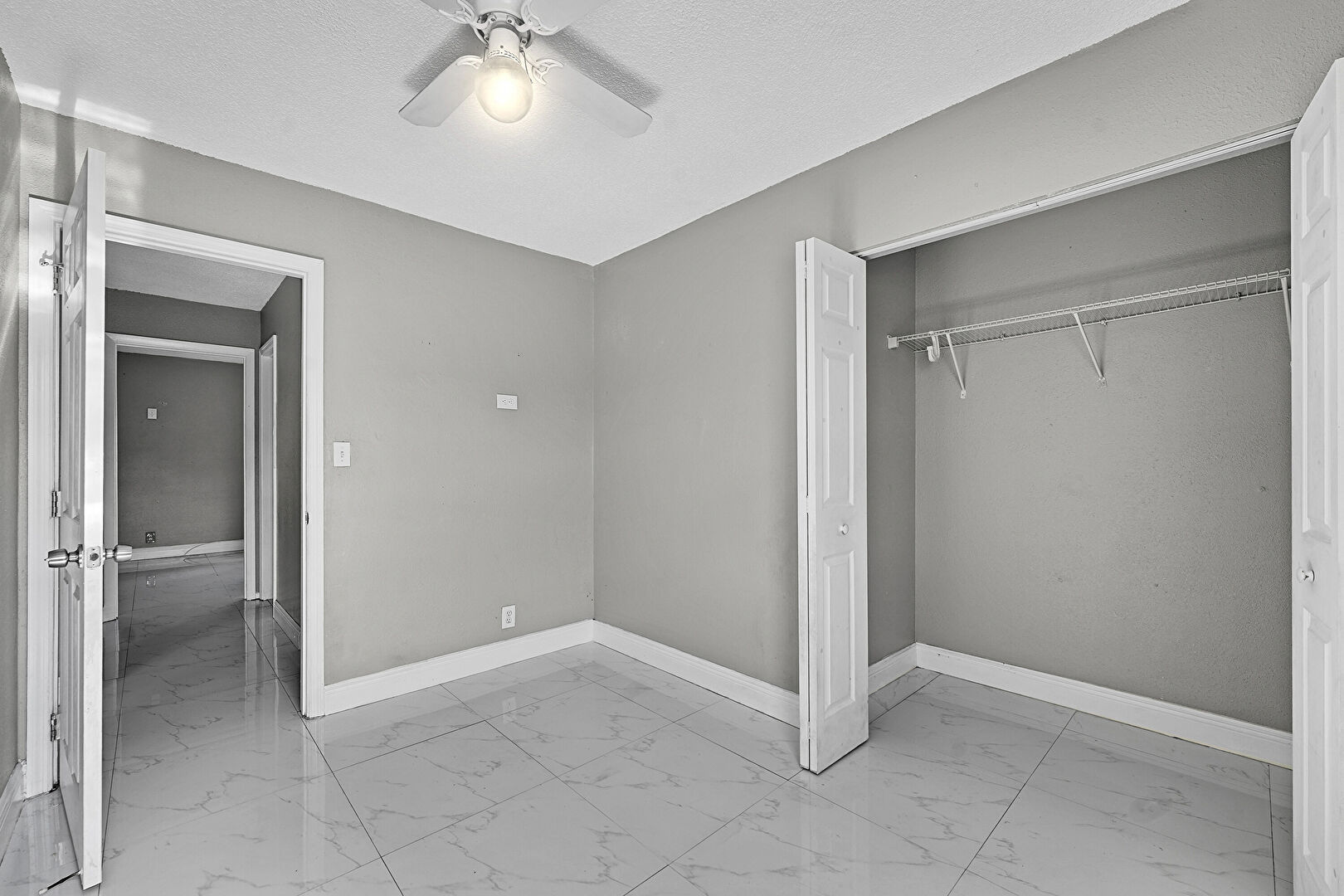 Baseboards Wall, Ceiling Fan, Closet, Drywall, Ensuite Bathroom, Marble Finish Floor, Natural Light, Textured Ceiling, Textured Wall, Vent, Baseboards Wall, Ceiling Fan, Closet, Marble Finish Floor, Natural Light, Two Closets