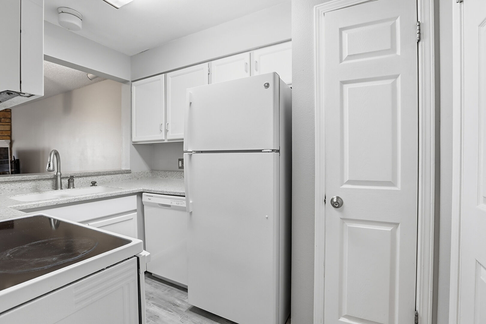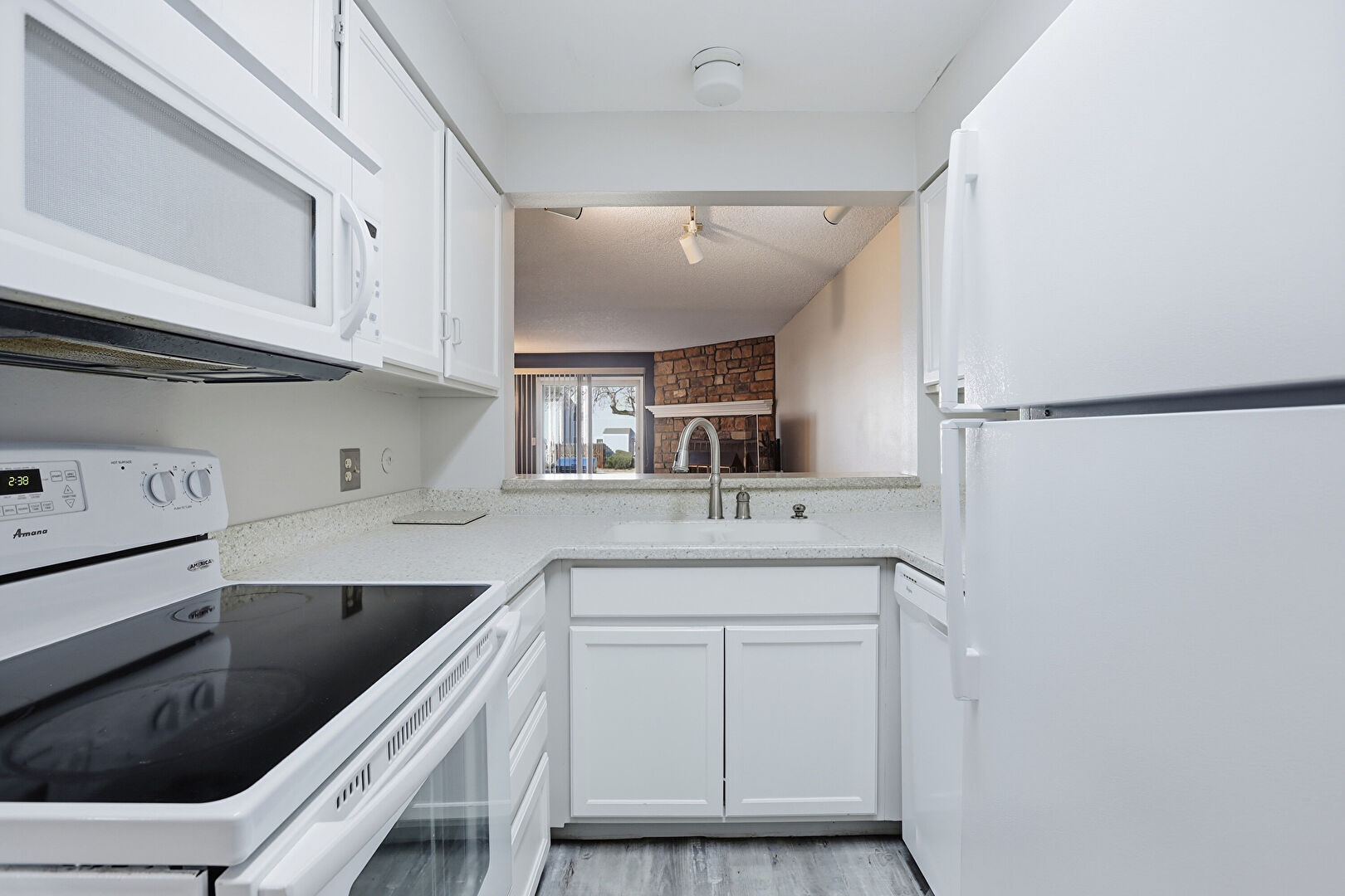 Drywall, Fireplace, Natural Light, Pass Through Window, Shaker Cabinets, Stone Countertops, Textured Ceiling, Track Lighting, Visible Hinge Cabinets, Wood Finish Floor, Baseboards Wall, Pass Through Window, Visible Hinge Cabinets