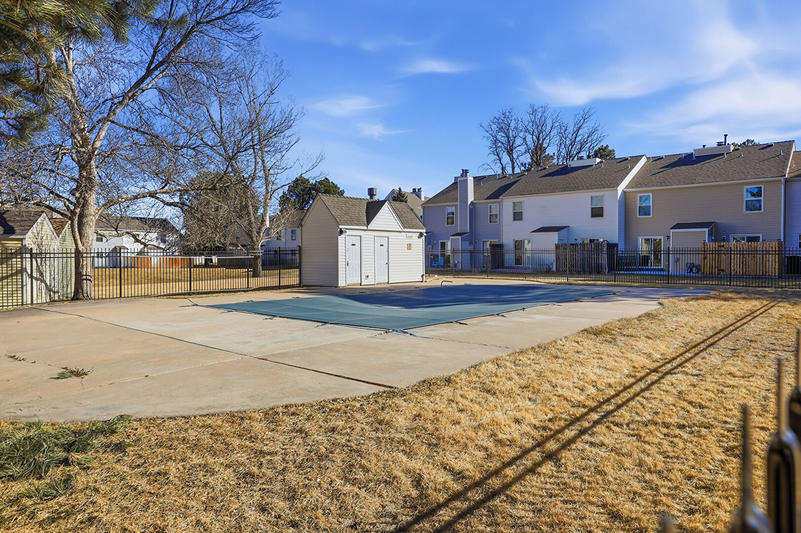 Fence, Lawn, Patio, Pool, Residential View, Outdoor Structure