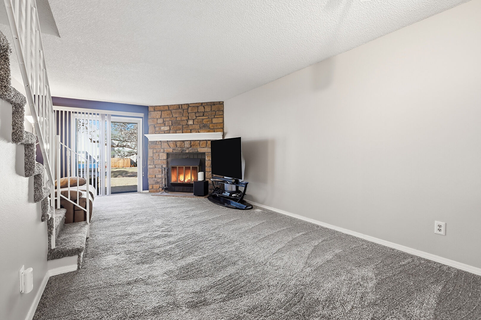 Baseboards Wall, Carpet, Drywall, Fireplace, Natural Light, Stairs, Textured Ceiling, Track Lighting, Vent, Wall Furnace, Baseboards Wall, Carpet, Natural Light