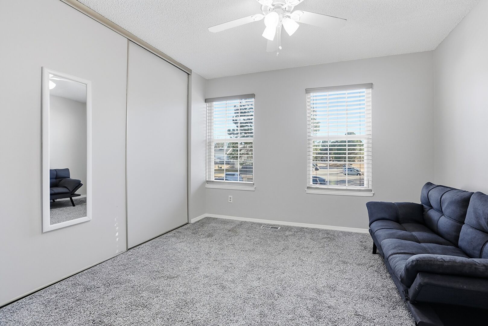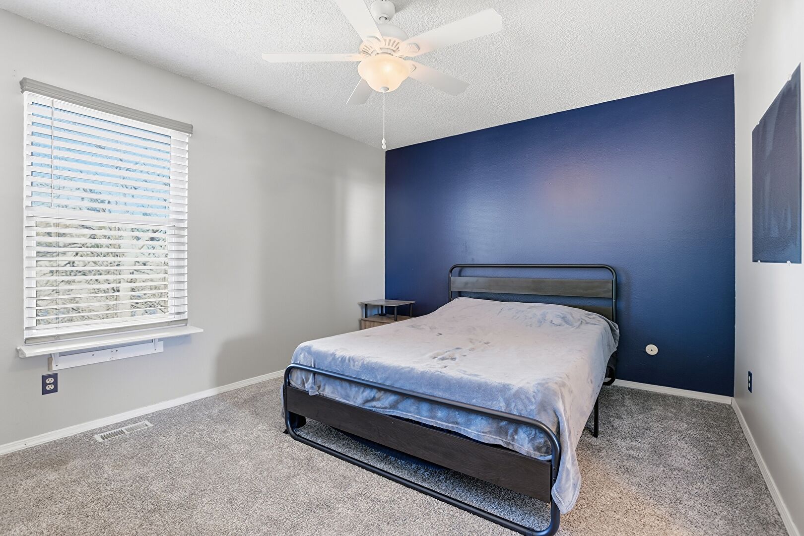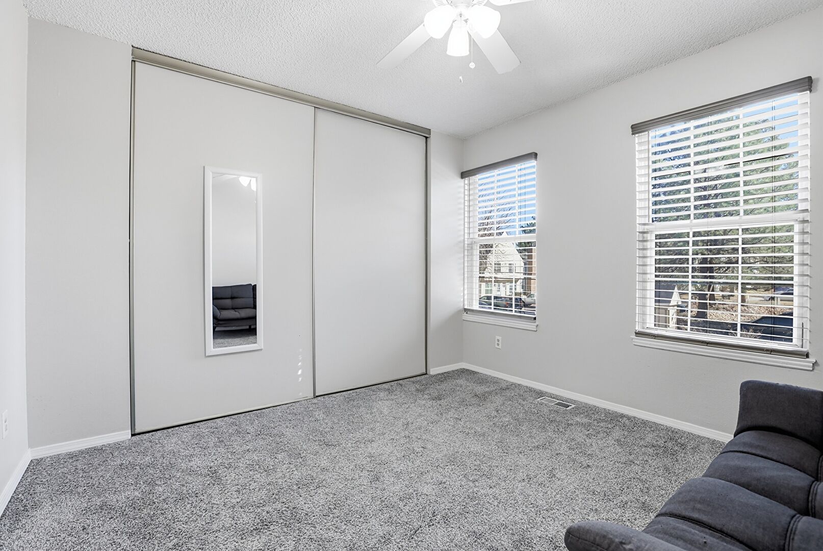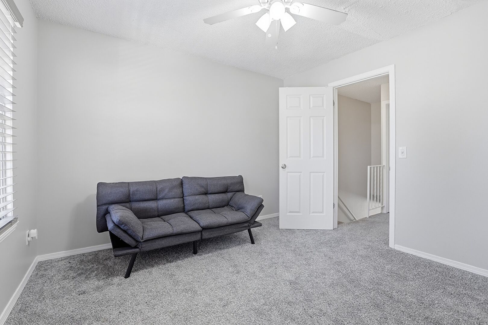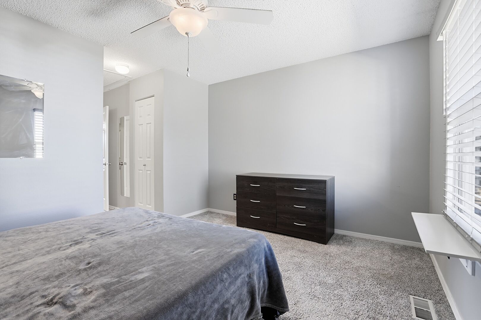 Baseboards Wall, Carpet, Ceiling Fan, Closet, Drywall, Natural Light, Textured Ceiling, Vent, Baseboards Wall, Carpet, Drop Stairs, Drywall, Natural Light