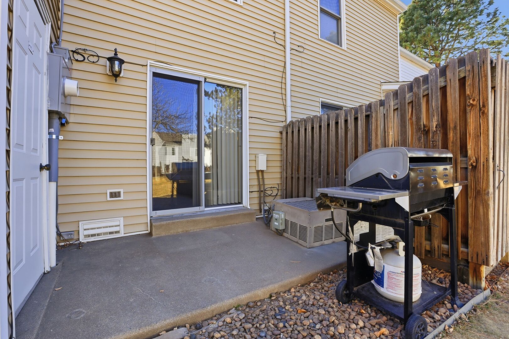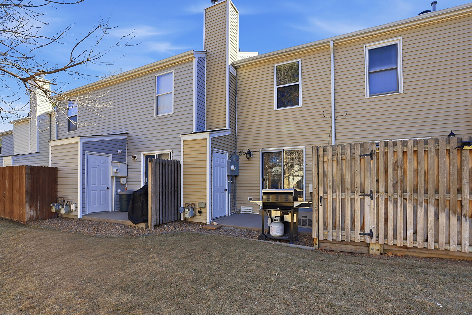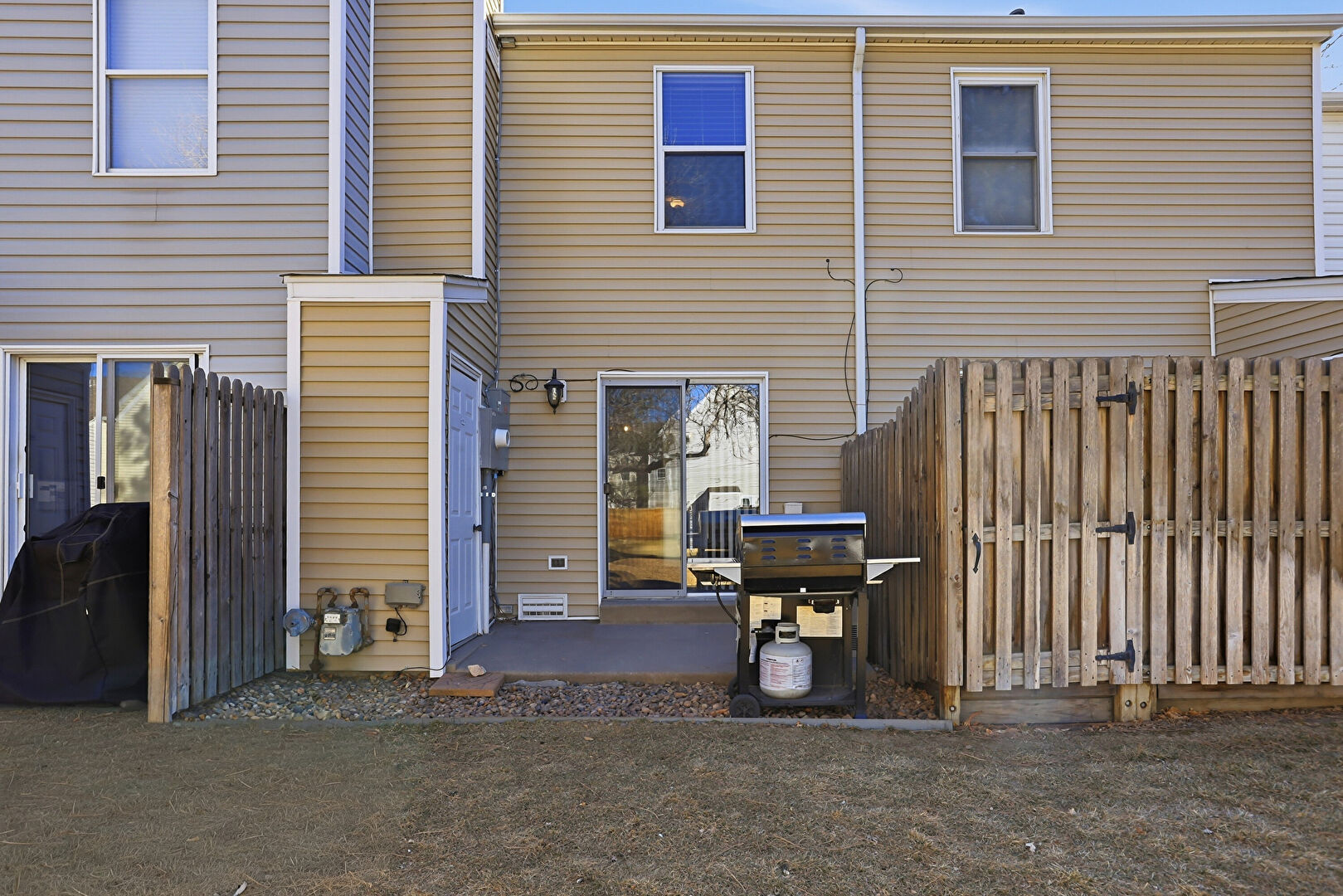 Downspout, Electric Meter, Fence, Gas Meter, Gate, Grill, Gutters, Horizontal Siding, Lawn, Patio, Chimney, Horizontal Siding