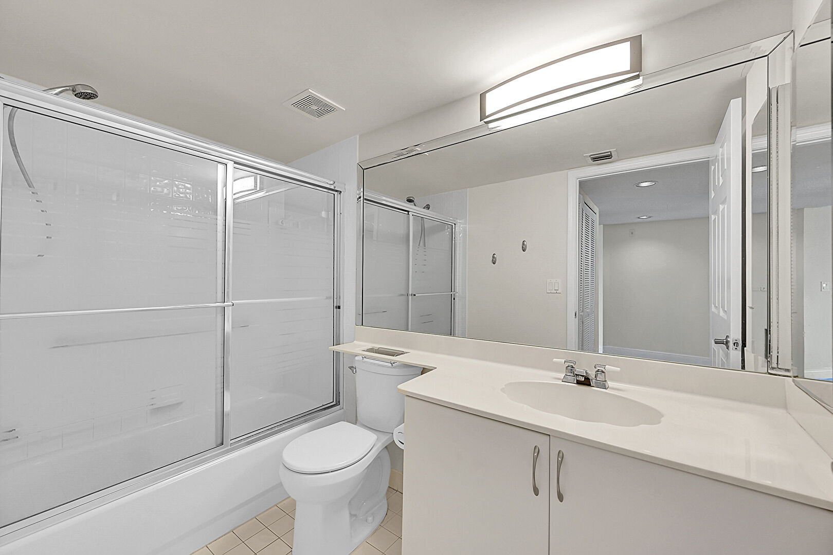 Drywall, Full Bathroom, Tile Floor, Vanity, Vent, Combined Bath Shower