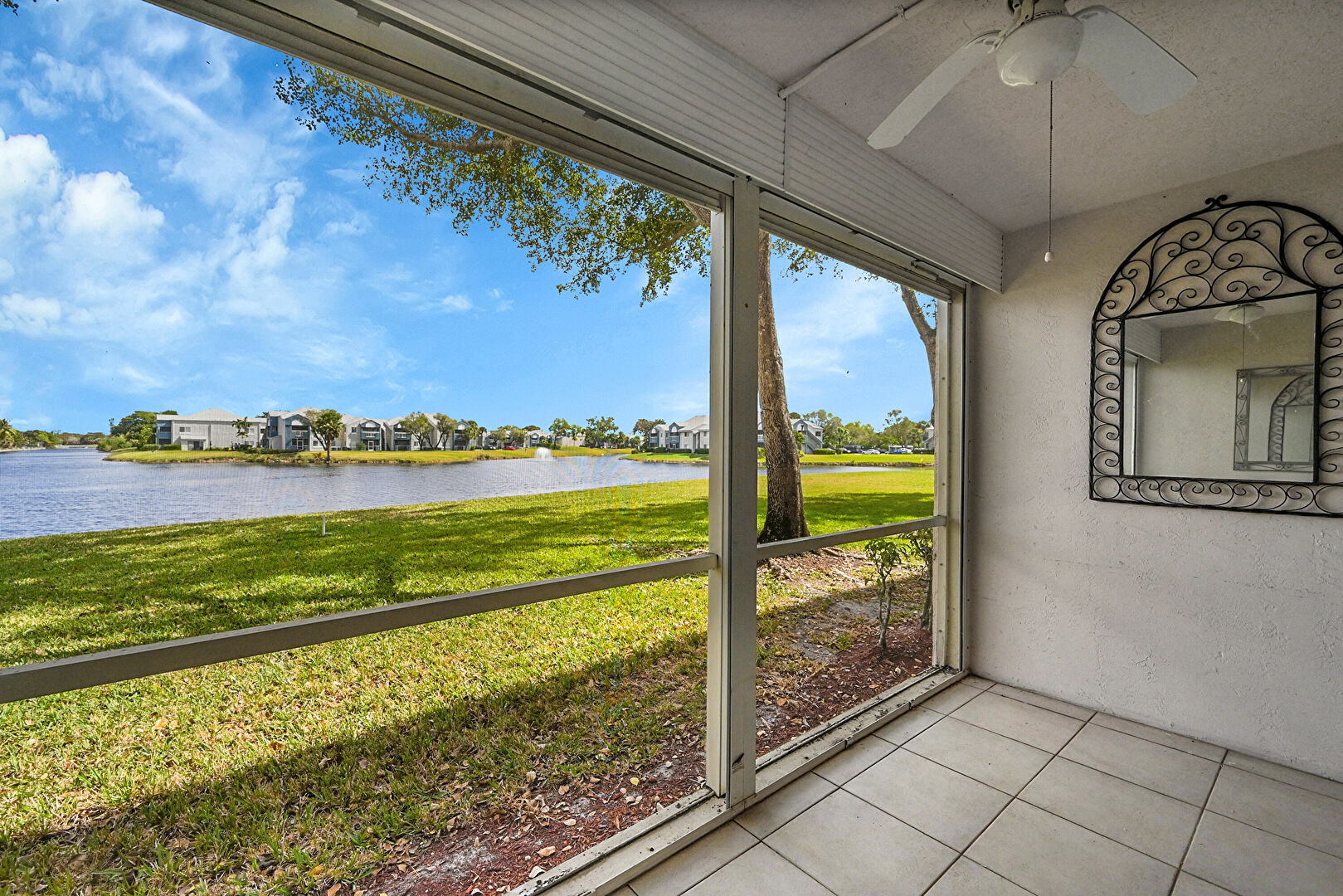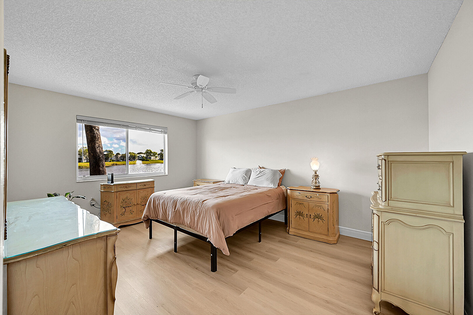 Baseboards Wall, Ceiling Fan, Drywall, Natural Light, Textured Ceiling, Tile Floor, Water View, Wood Finish Floor, Baseboards Wall, Natural Light, Vent