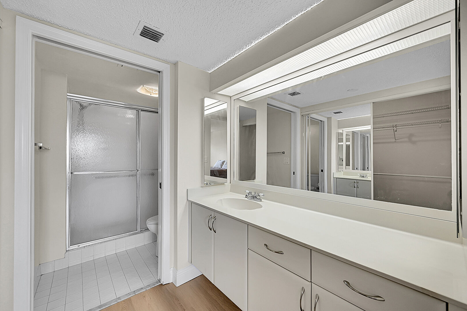 Baseboards Wall, Drywall, Full Bathroom, Vanity, Vent, Walk In Closet, Wood Finish Floor, Full Bathroom, Textured Ceiling