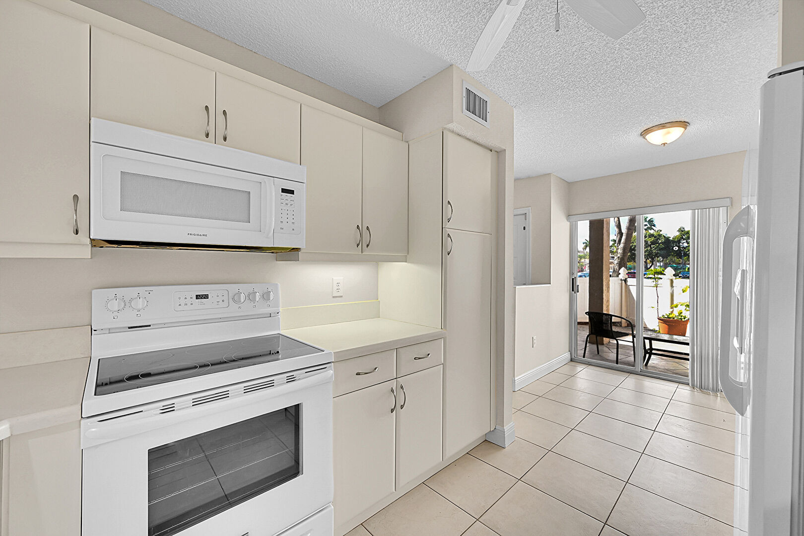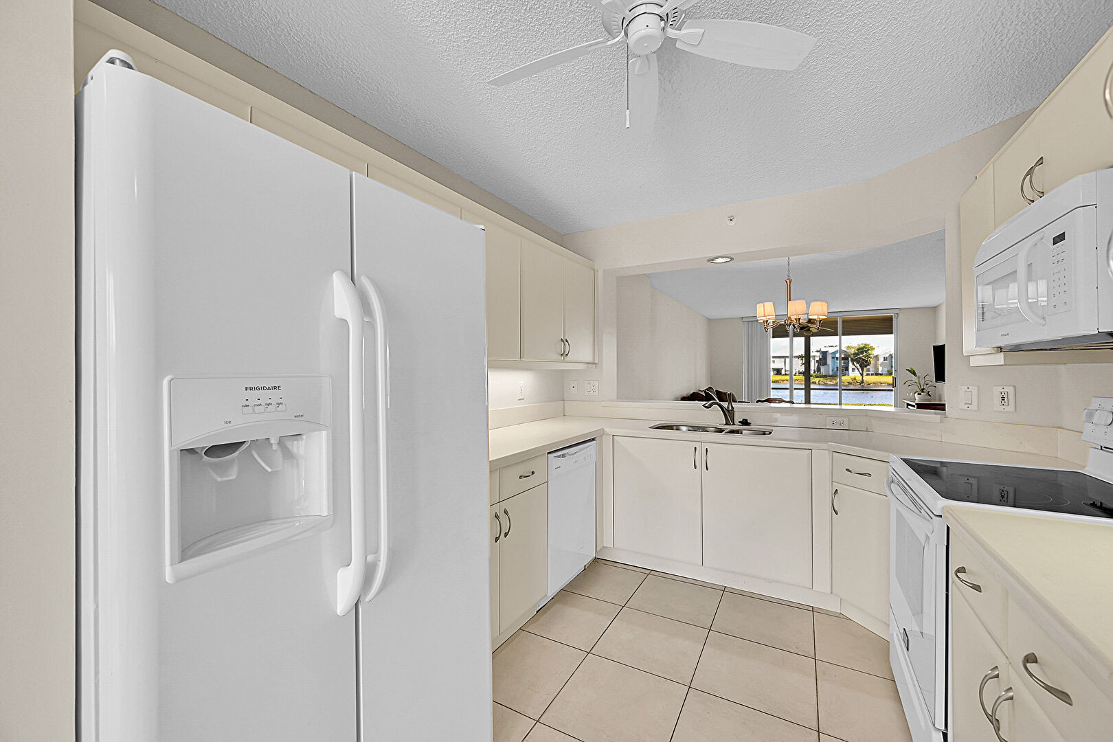 Baseboards Wall, Ceiling Fan, Drywall, Natural Light, Notable Chandelier, Pass Through Window, Pendant Lighting, Textured Ceiling, Tile Floor, Ceiling Fan, Drywall, Vent