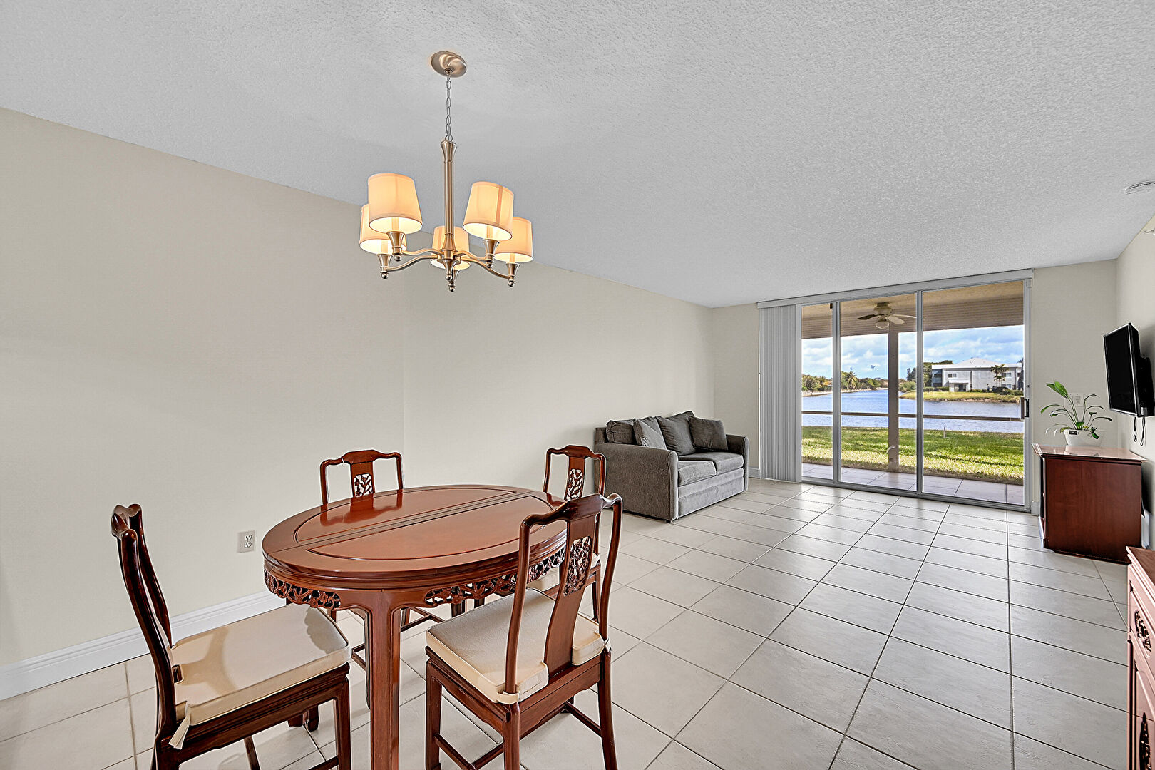 Baseboards Wall, Drywall, Natural Light, Notable Chandelier, Textured Ceiling, Tile Floor, Waterfront, Floor Ceiling Windows