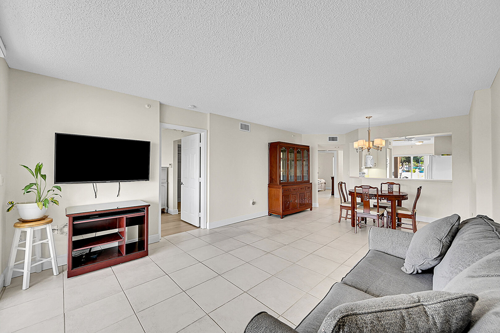 Baseboards Wall, Drywall, Natural Light, Notable Chandelier, Textured Ceiling, Tile Floor, Vent, Baseboards Wall, Notable Chandelier