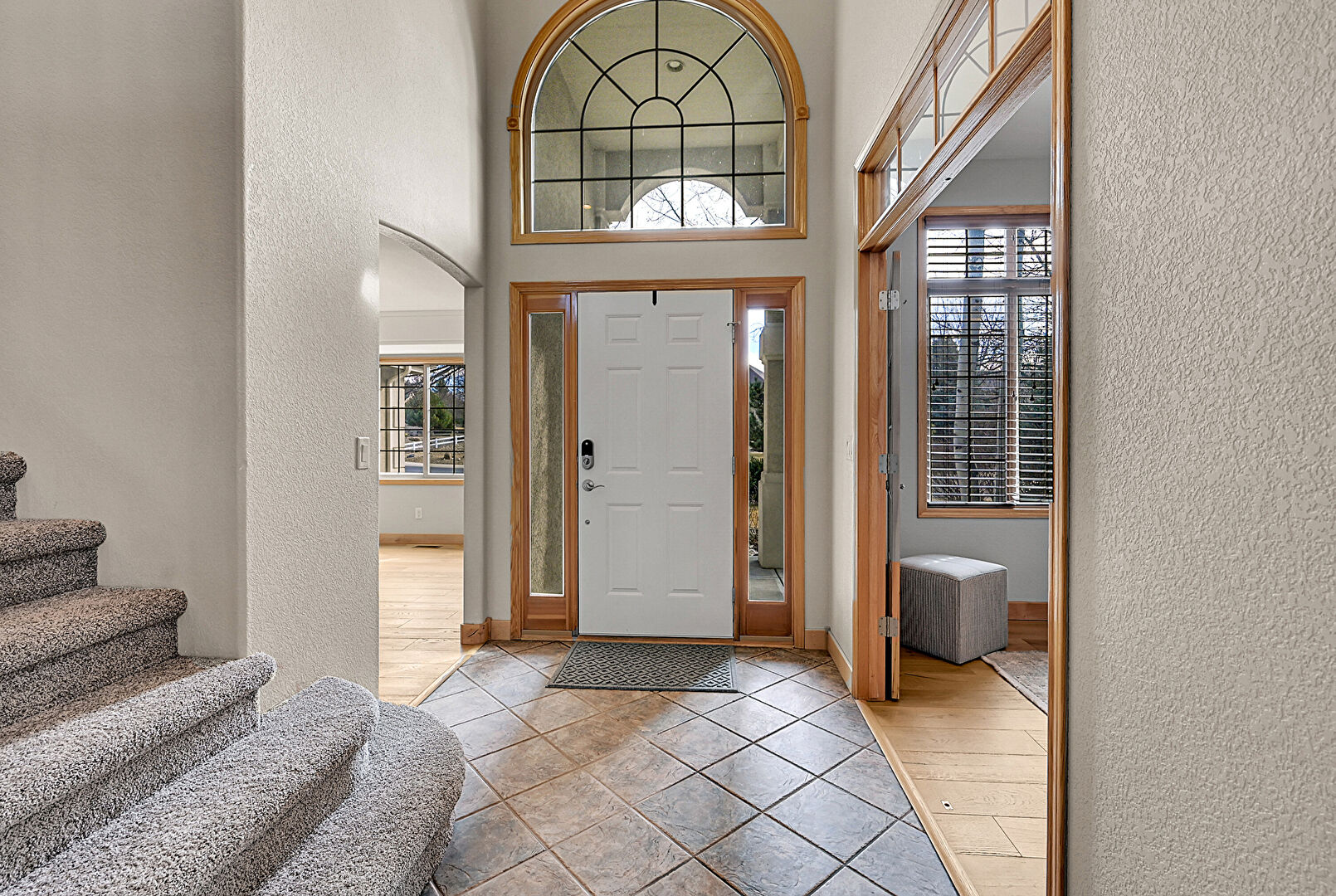 Baseboards Wall, Drywall, Fireplace, High Ceiling, Natural Light, Notable Chandelier, Stairs, Textured Wall, Tile Floor, Vent, Wood Finish Floor, Arched Walkways, Tile Floor