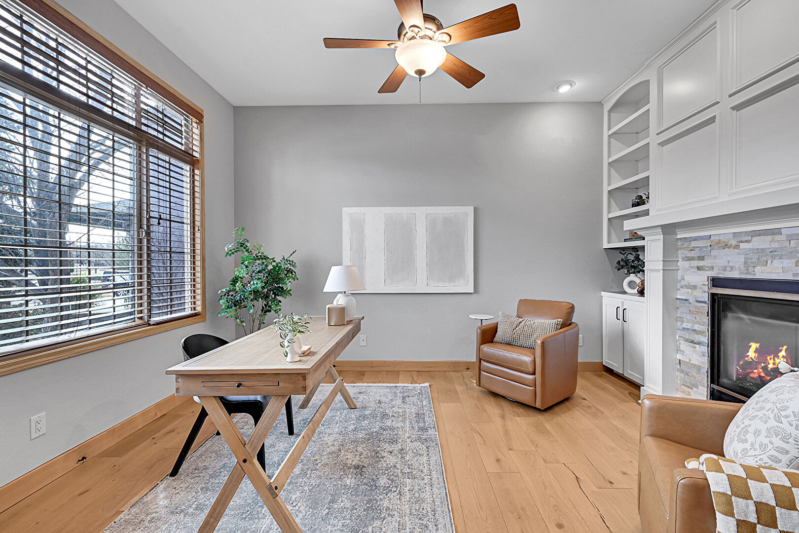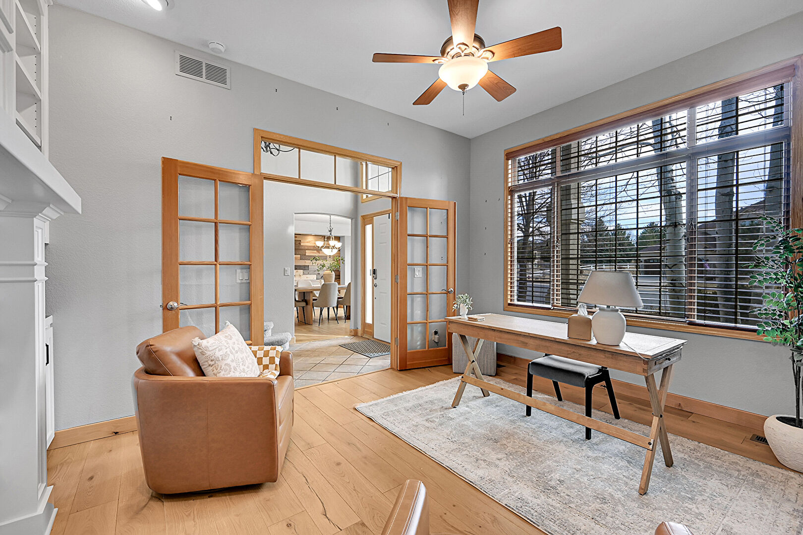 Baseboards Wall, Built In Shelves, Ceiling Fan, Drywall, Fireplace, French Doors, Natural Light, Notable Chandelier, Office Area, Recessed Lighting, Vent, Wood Finish Floor, Arched Walkways, Baseboards Wall, Built In Shelves