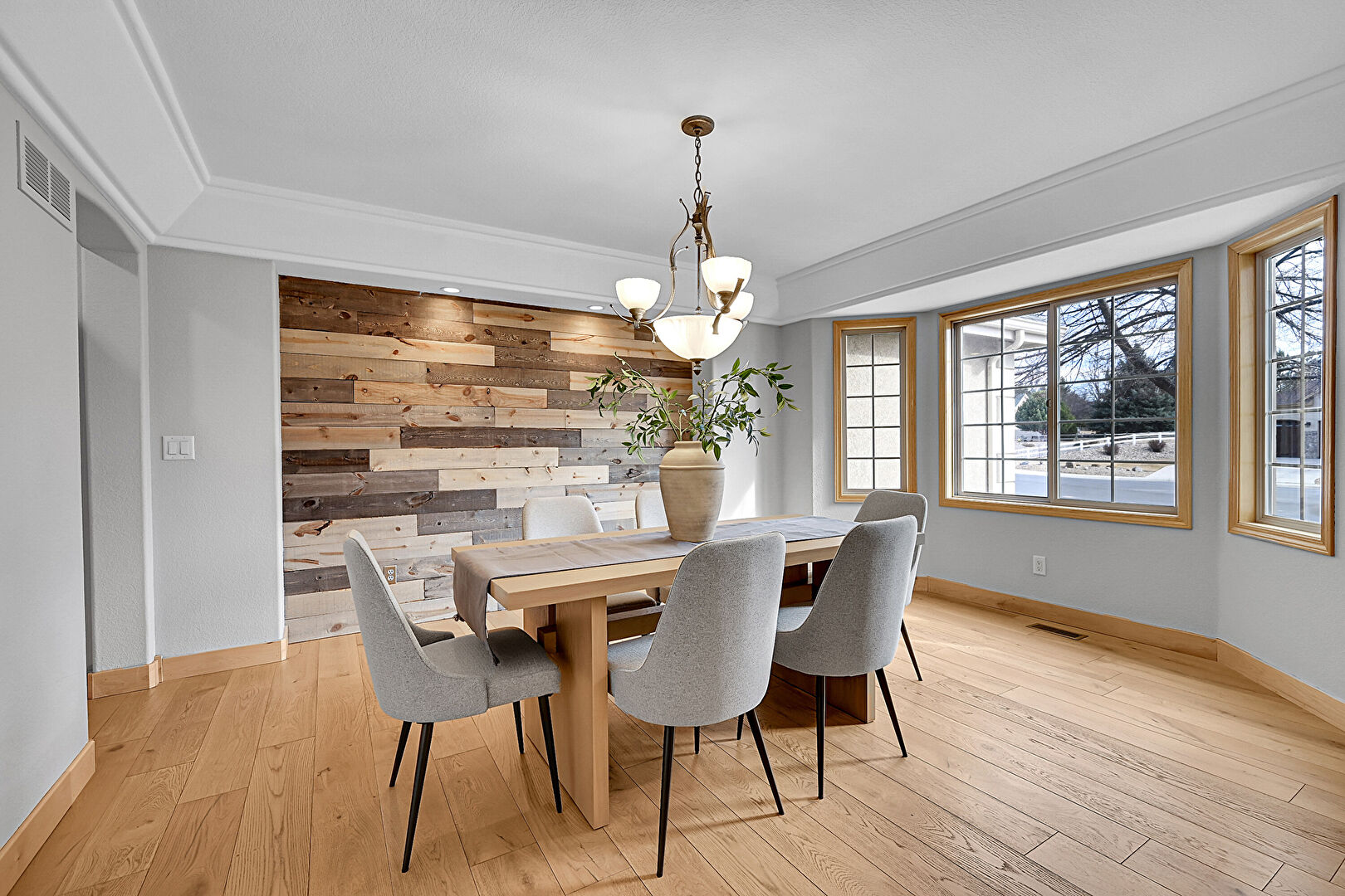 Accent Wall, Arched Walkways, Baseboards Wall, Crown Molding, Drywall, Natural Light, Notable Chandelier, Recessed Lighting, Vent, Wood Finish Floor, Wood Wall, Accent Wall, Ceiling Fan, Wood Finish Floor