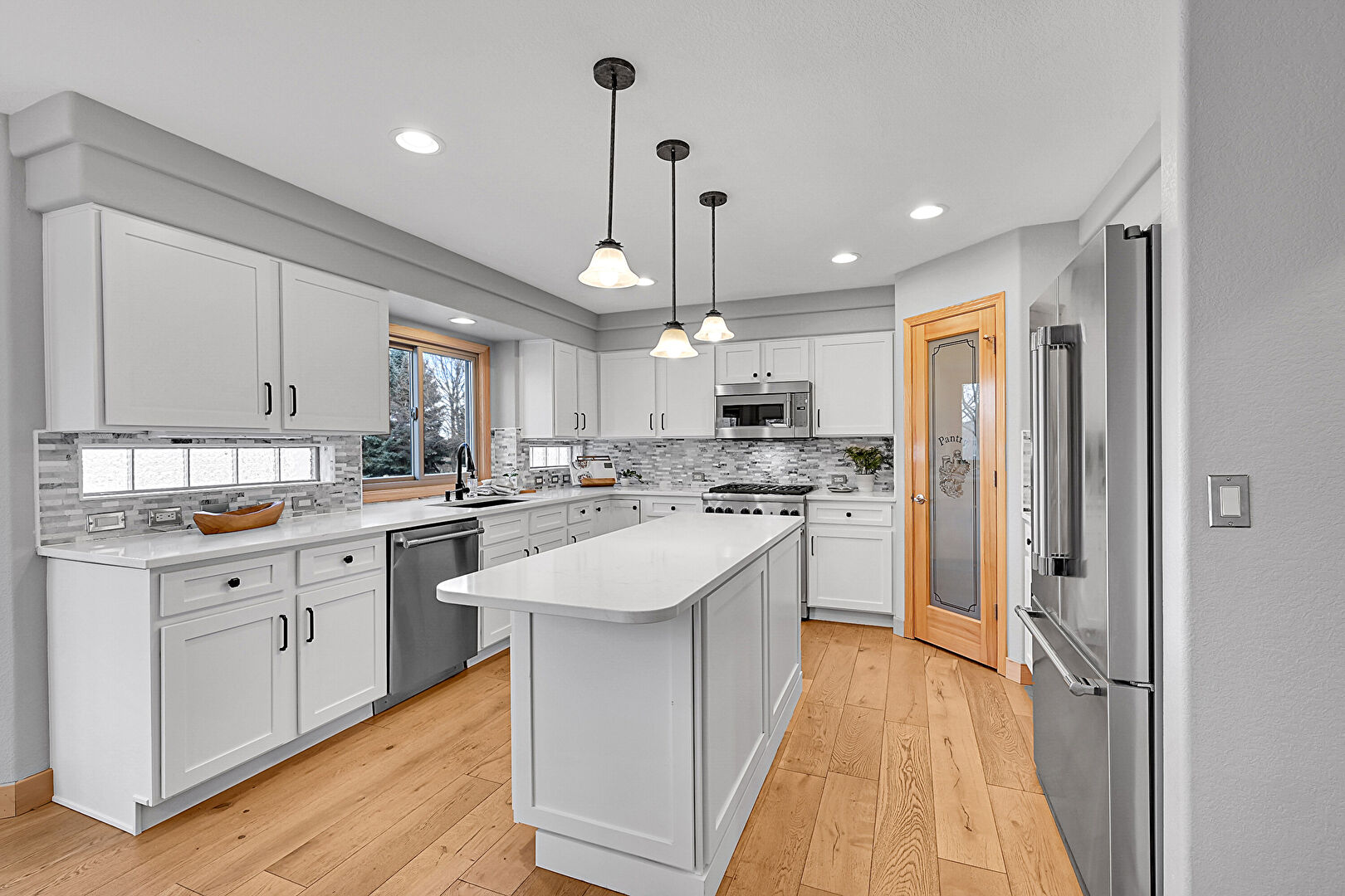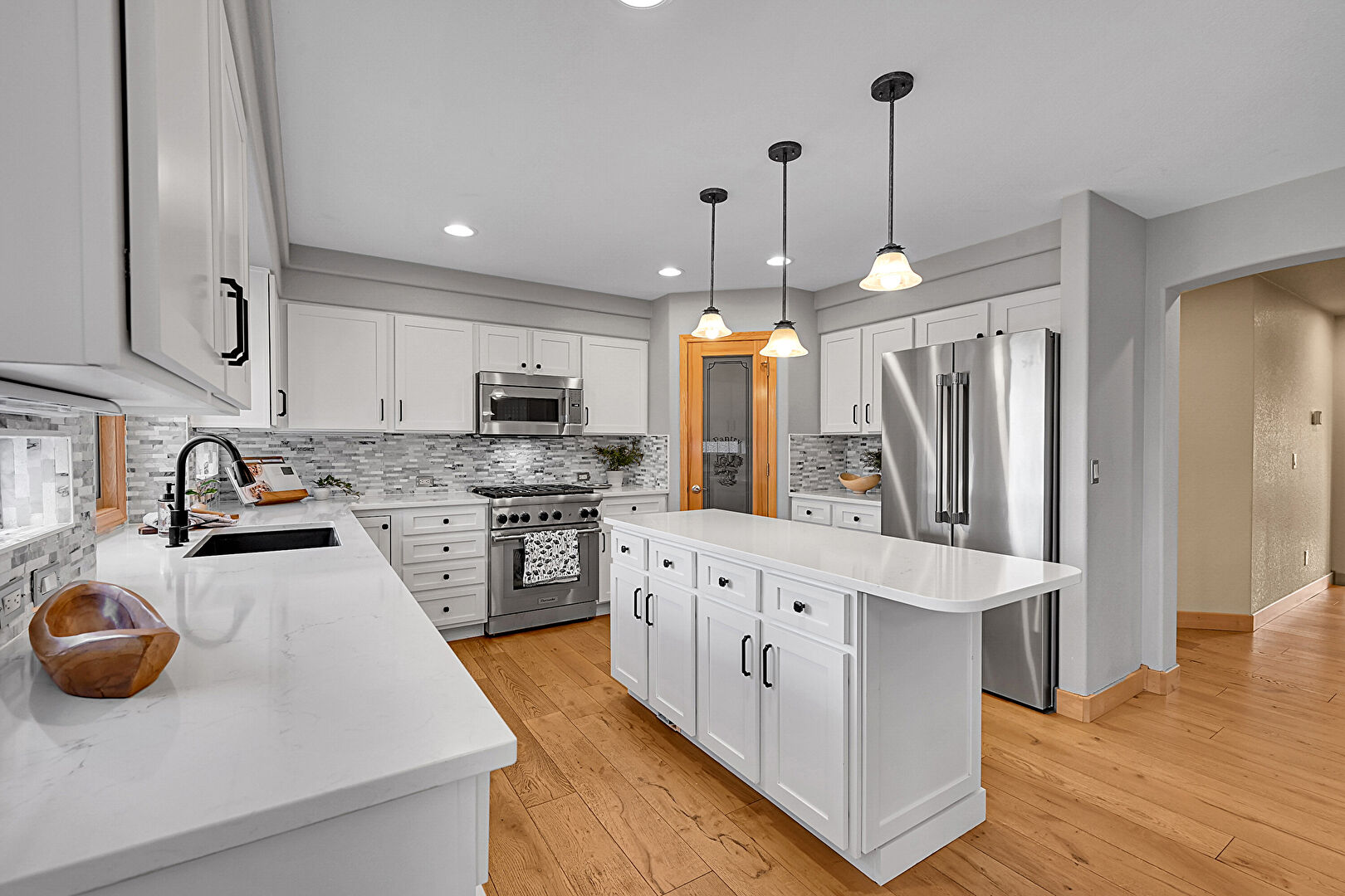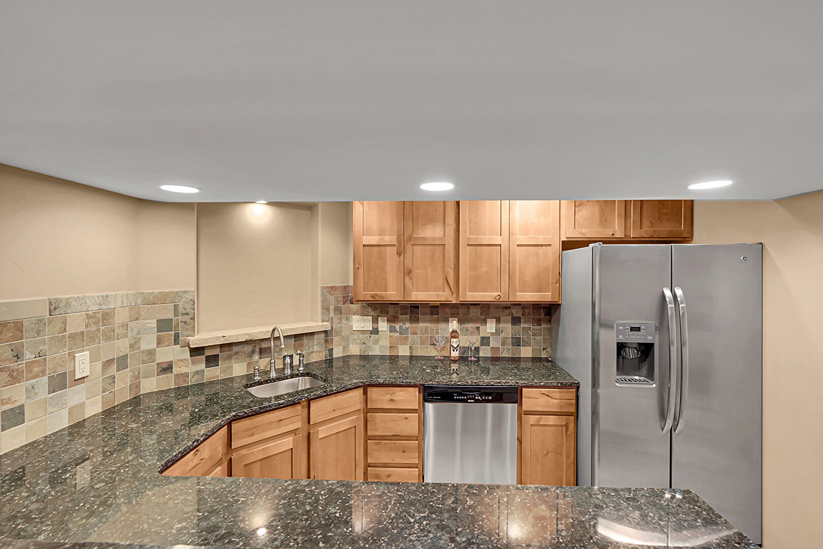 Arched Walkways, Baseboards Wall, Drywall, Kitchen Bar, Kitchen Island, Kitchen Peninsula, Medium Brown Cabinets, Natural Light, Pendant Lighting, Recessed Lighting, Shaker Cabinets, Stone Countertops, U Shaped Kitchen, Vent, Wood Finish Floor, Arched Walkways, Baseboards Wall, Drywall, Pendant Lighting, Shaker Cabinets, Stone Countertops, Wood Finish Floor