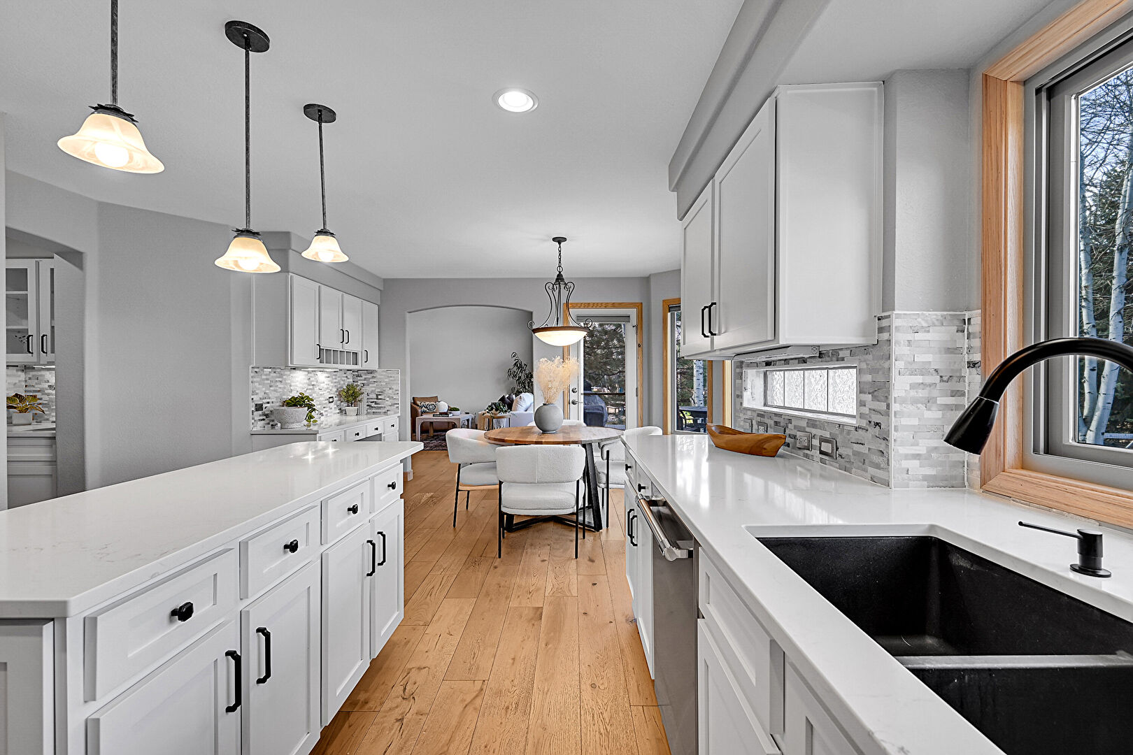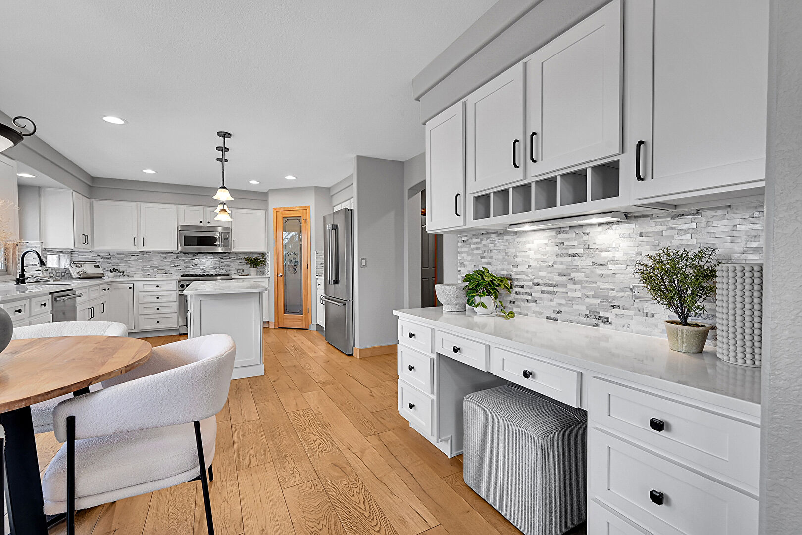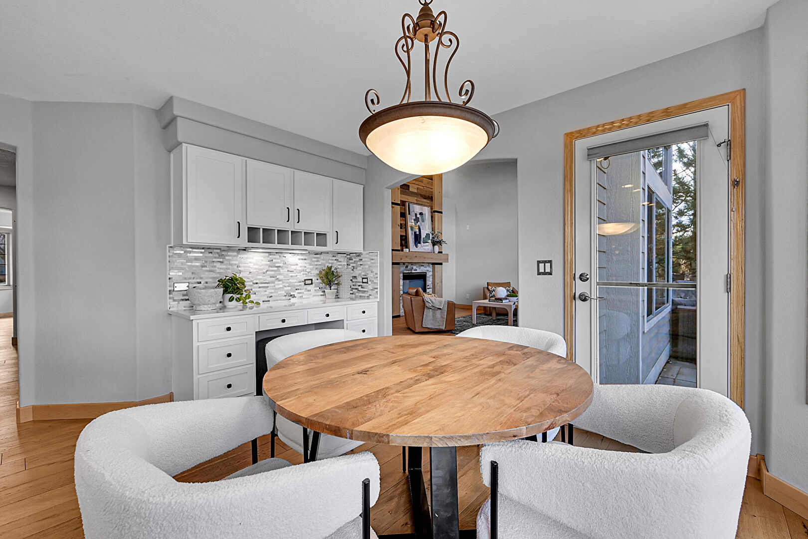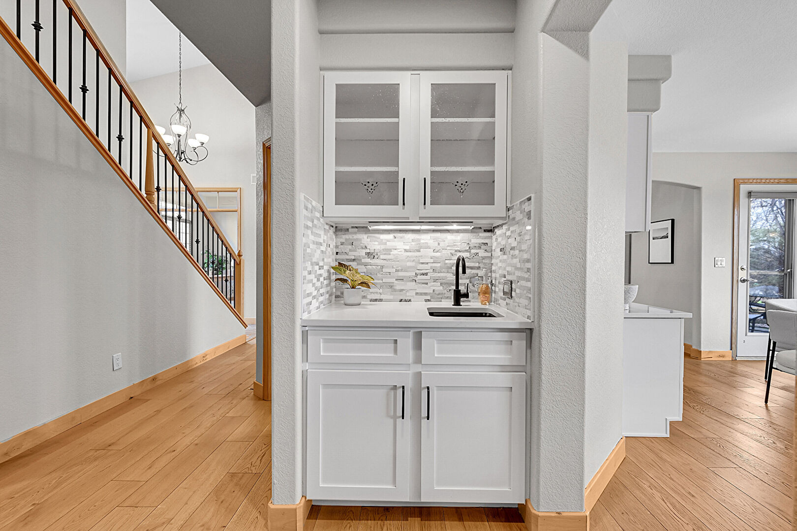 Baseboards Wall, Drywall, Glass Insert Cabinets, Natural Light, Notable Chandelier, Pendant Lighting, Shaker Cabinets, Stairs, Stone Countertops, Wood Finish Floor, Indoor Bar