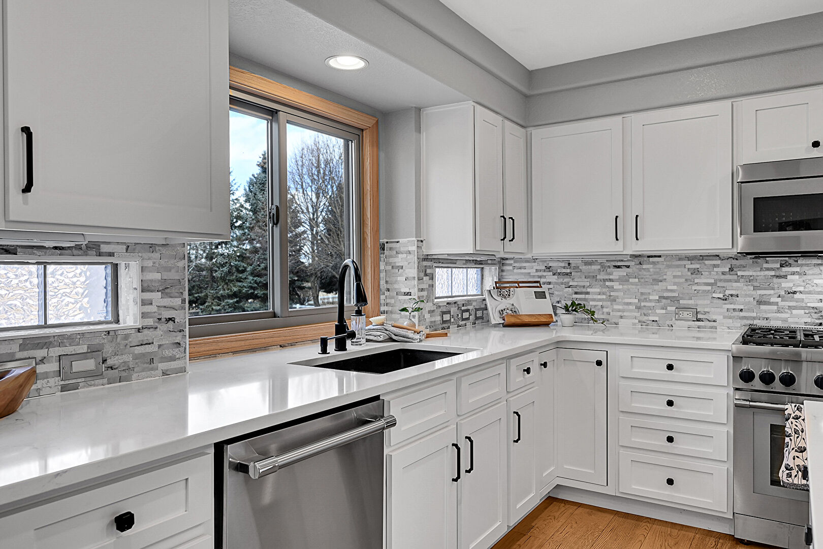 Baseboards Wall, Drywall, Natural Light, Recessed Lighting, U Shaped Kitchen, Wood Finish Floor, Baseboards Wall, Fireplace