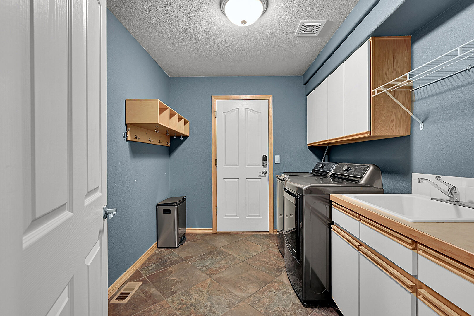 Laundry, Stone Finish Floor, Textured Ceiling, Textured Wall, Vent, Baseboards Wall
