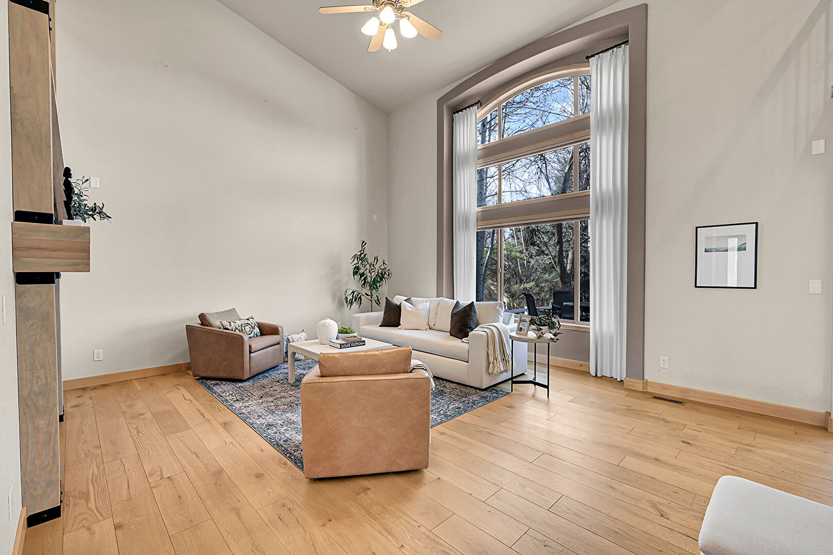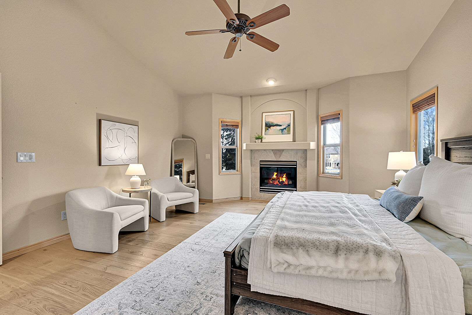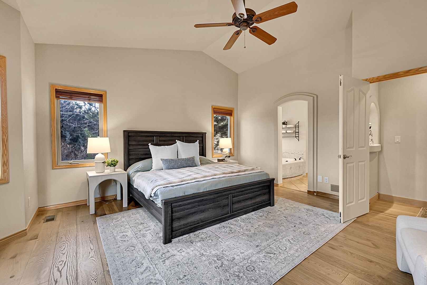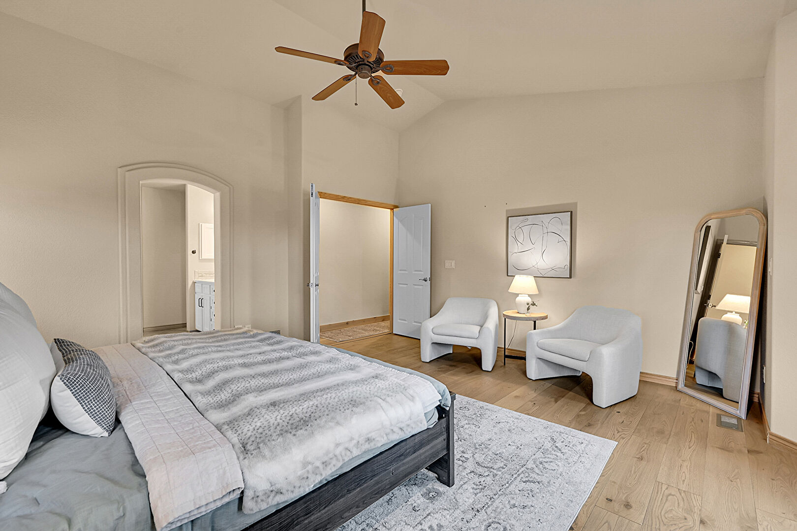 Baseboards Wall, Ceiling Fan, Drywall, Ensuite Bathroom, Fireplace, High Ceiling, Natural Light, Vaulted Ceiling, Vent, Wood Finish Floor, Arched Walkways, Ceiling Fan, Natural Light, Vaulted Ceiling