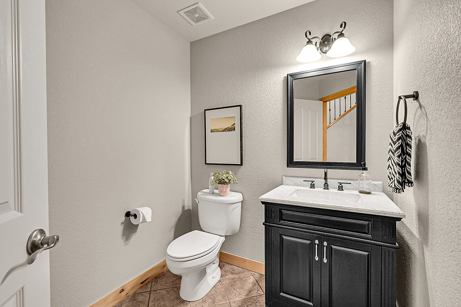 Half Bathroom, Textured Wall, Tile Floor, Vanity, Vent, Baseboards Wall