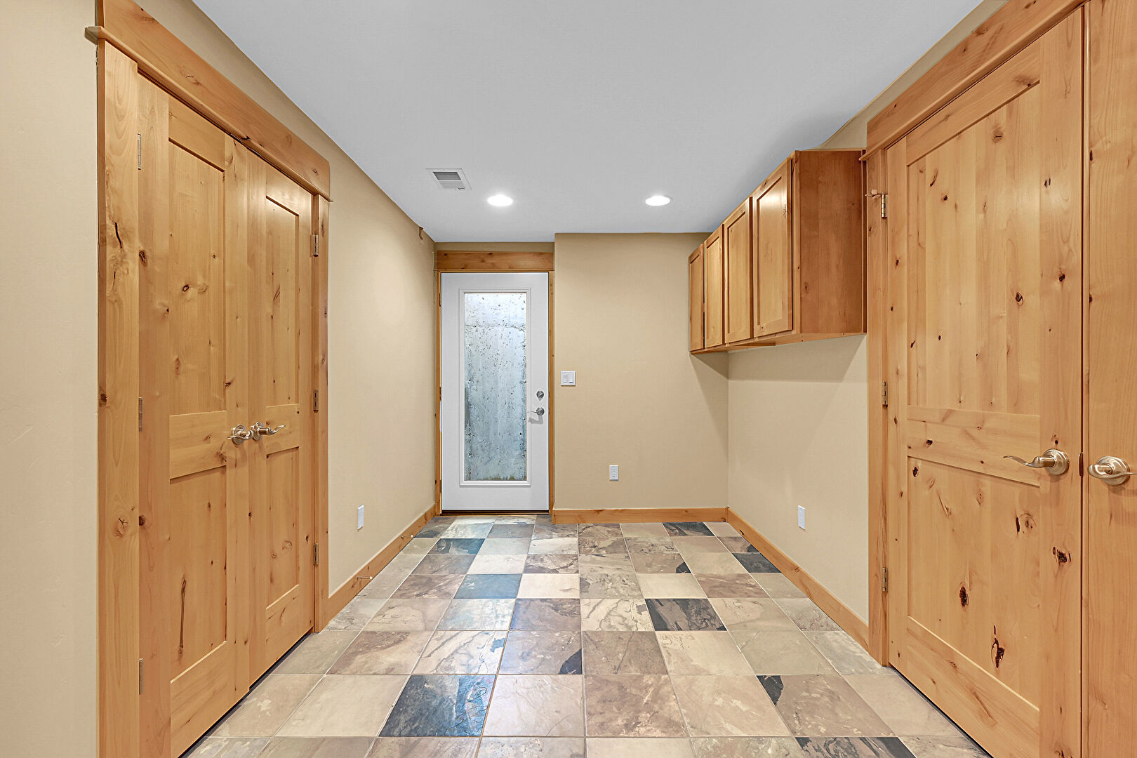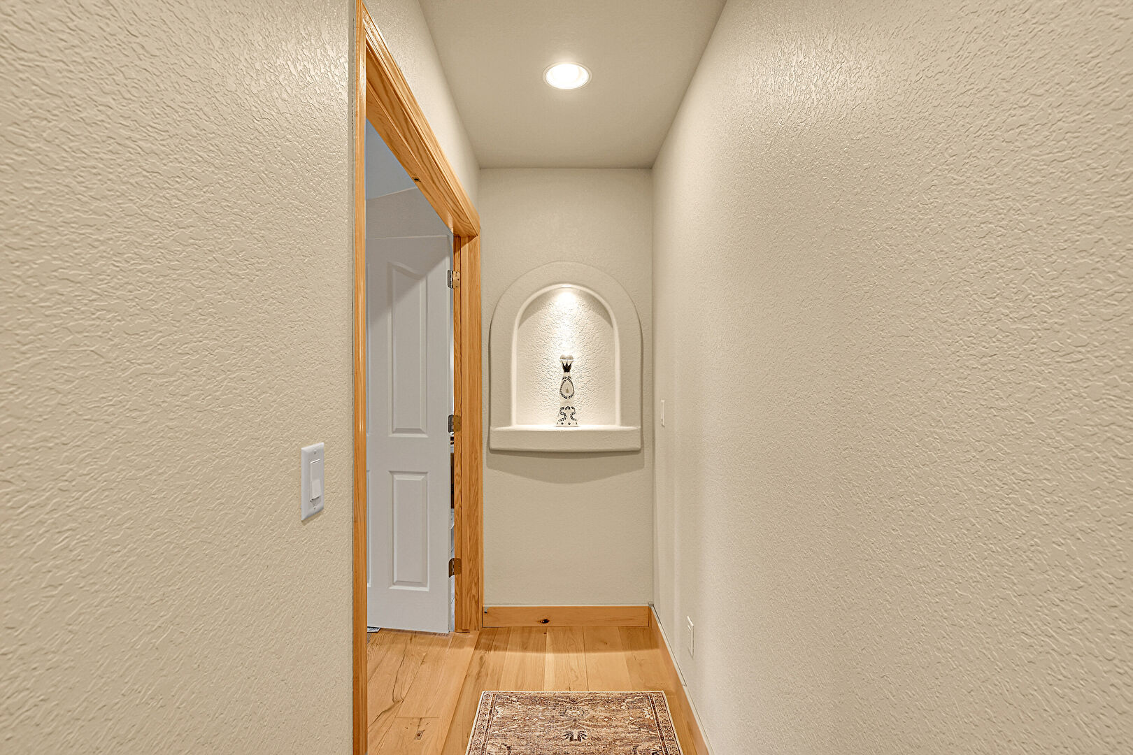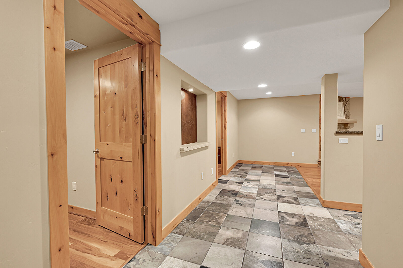 Baseboards Wall, Drywall, Recessed Lighting, Stone Finish Floor, Textured Wall, Vent, Wood Finish Floor