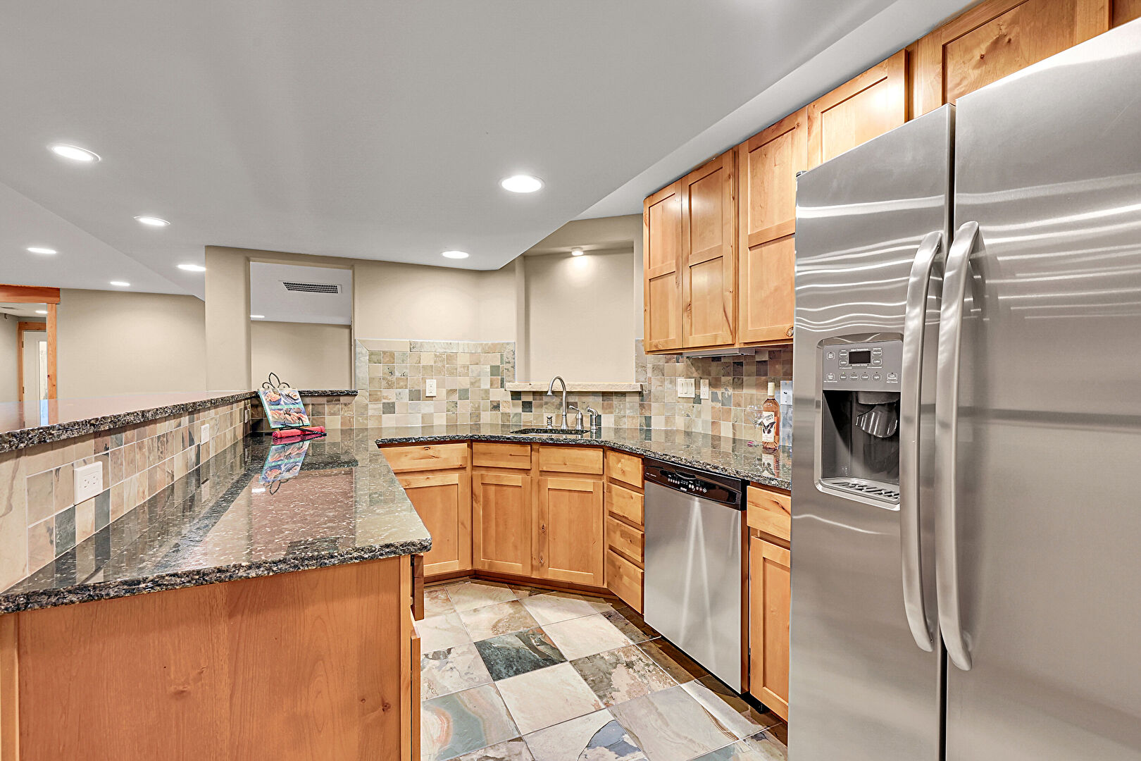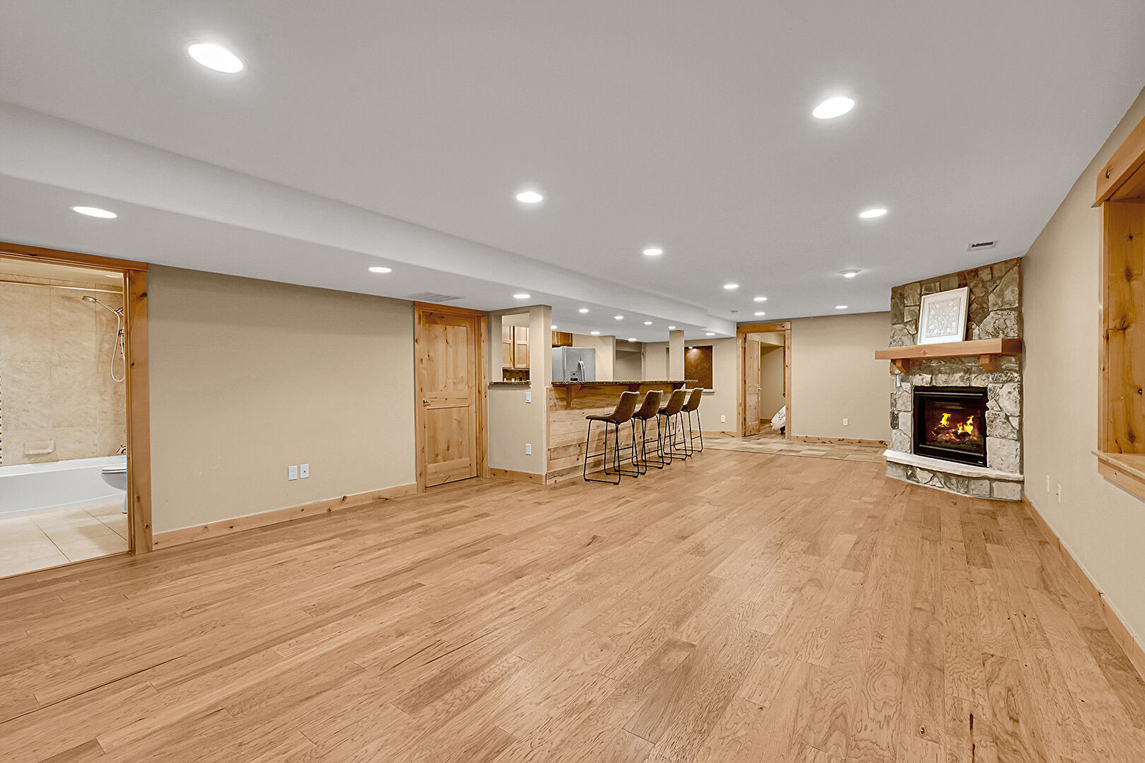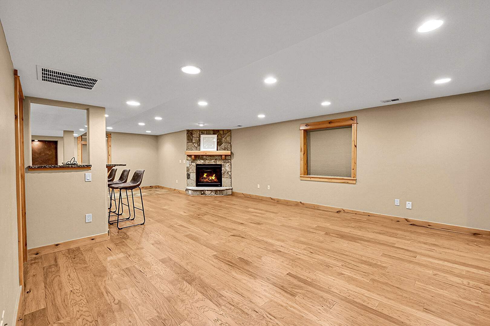 Baseboards Wall, Basement, Drywall, Fireplace, Indoor Bar, Kitchen Bar, Medium Brown Cabinets, Opens To Living Area, Recessed Lighting, Shaker Cabinets, Stone Countertops, Stone Finish Floor, Vent, Wood Finish Floor, Drywall, Recessed Lighting