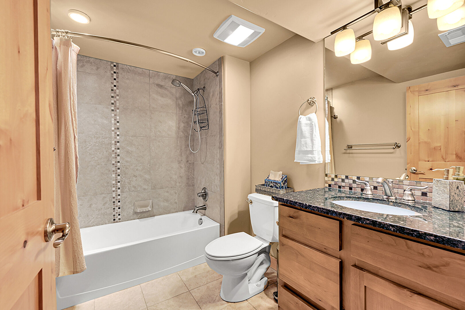 Combined Bath Shower, Drywall, Full Bathroom, Vanity, Vent, Tile Floor