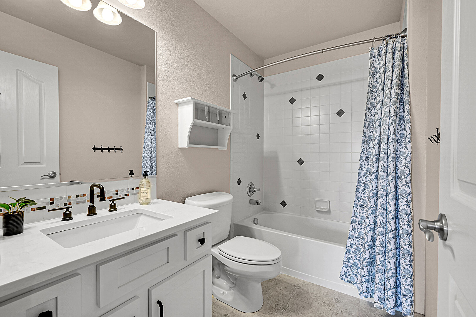 Full Bathroom, Textured Wall, Vanity, Combined Bath Shower