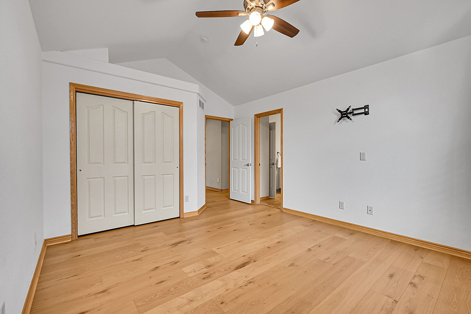 Baseboards Wall, Cathedral Ceiling, Ceiling Fan, Closet, Drywall, Natural Light, Textured Wall, Vaulted Ceiling, Wood Finish Floor, Vaulted Ceiling, Vent